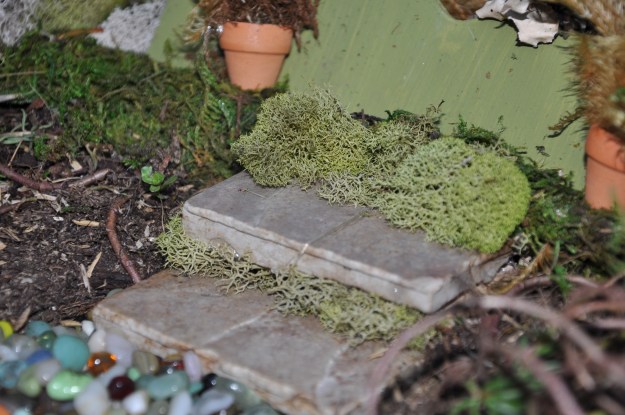 Using a plastic tray and a generous amount of cello-tape, I waterproofed the paper for the background as well as the sign.  I purchased a small wooden frame for a dollar at our local craft store and painted it a soothing garden green.  Touches of moss and dirt gave it a woodsy touch, as well as the Sedum and petrified wood nearby.  A small gravel path leads to the heart-shaped entrance.  Stairs (made from leftover tile pieces) sit on small wooden blocks.  Just follow the colorful path.