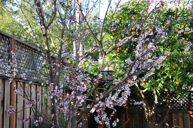 I’ve been trying all week to  get a decent photo of our four-in-one fruit tree.  Earlier in the week it was grey and the photos reflected that.  Now that the sun is out, I’m having trouble getting the contrast.  So, here is my attempt at a photo of the tree.  Please use your imagination when I say it is quite beautiful.  I wish I could share it with you up close.