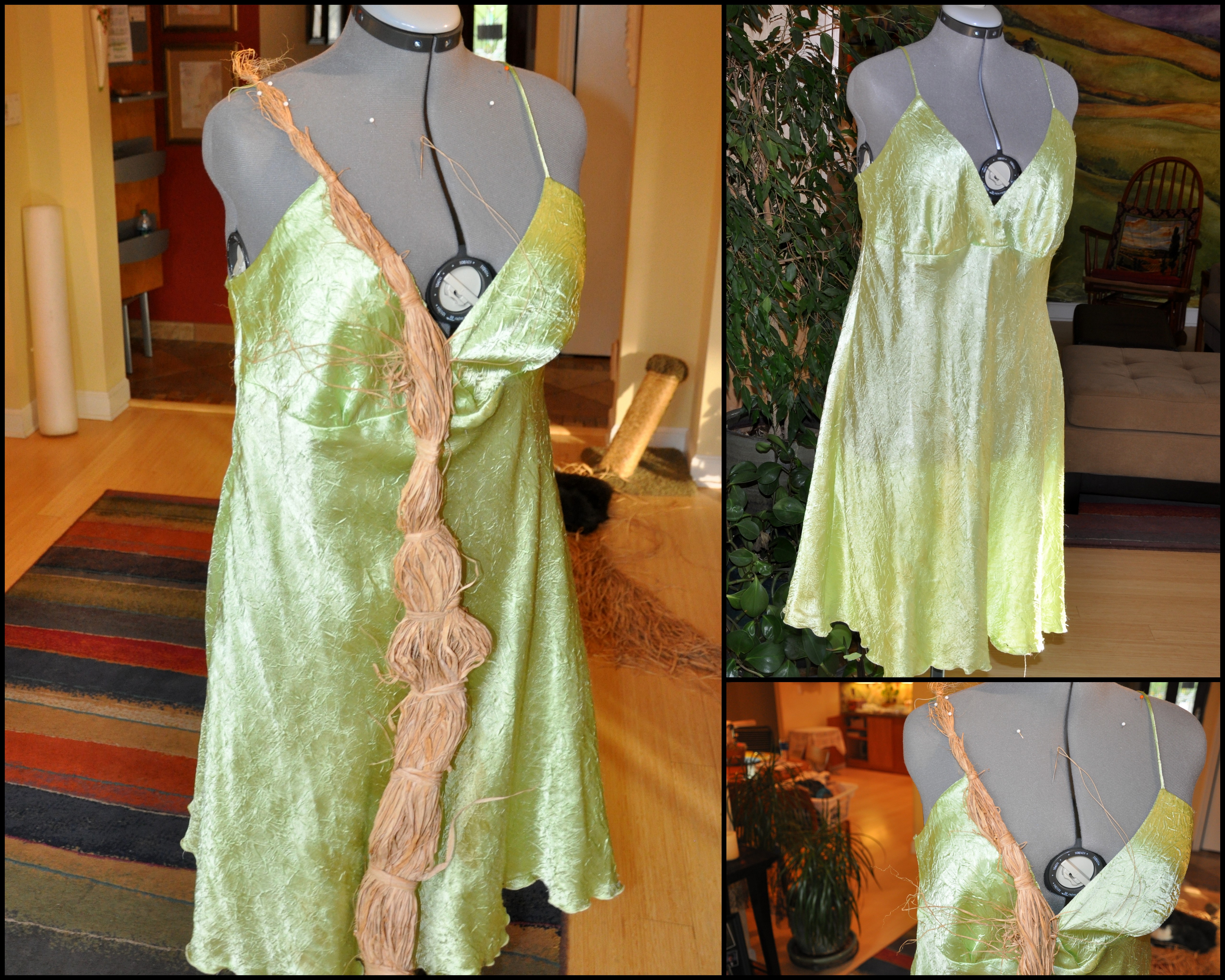 This year, the green slip is the foundation for Ms. California Drought. I found six-foot bundles of raffia on sale at a local craft store and used it to form the dress. I hand stitched the narrow ends to the bodice, then machine stitched the lengths around the waist. I used a few single strands of raffia to sew the loose ends to the dress and to attach my bra the night of the party. I used a length of wide ribbon for the waist and called it a dress.