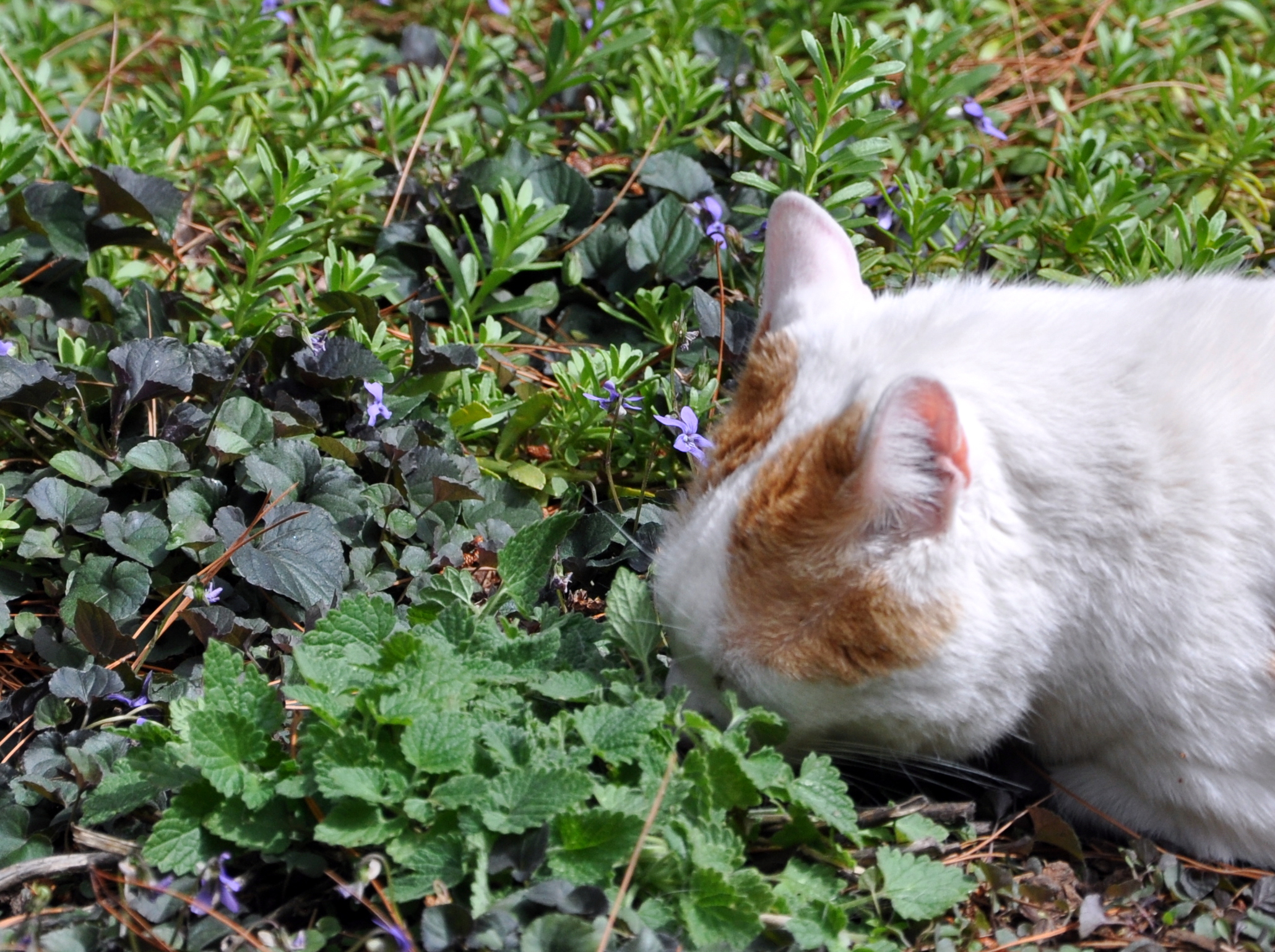Well, your carpet of garden barely leaves any room for weeds to start! Awesome! I see Mousie found a way in. What an lovely thing to have your kitties room around and enjoy the garden too. <3