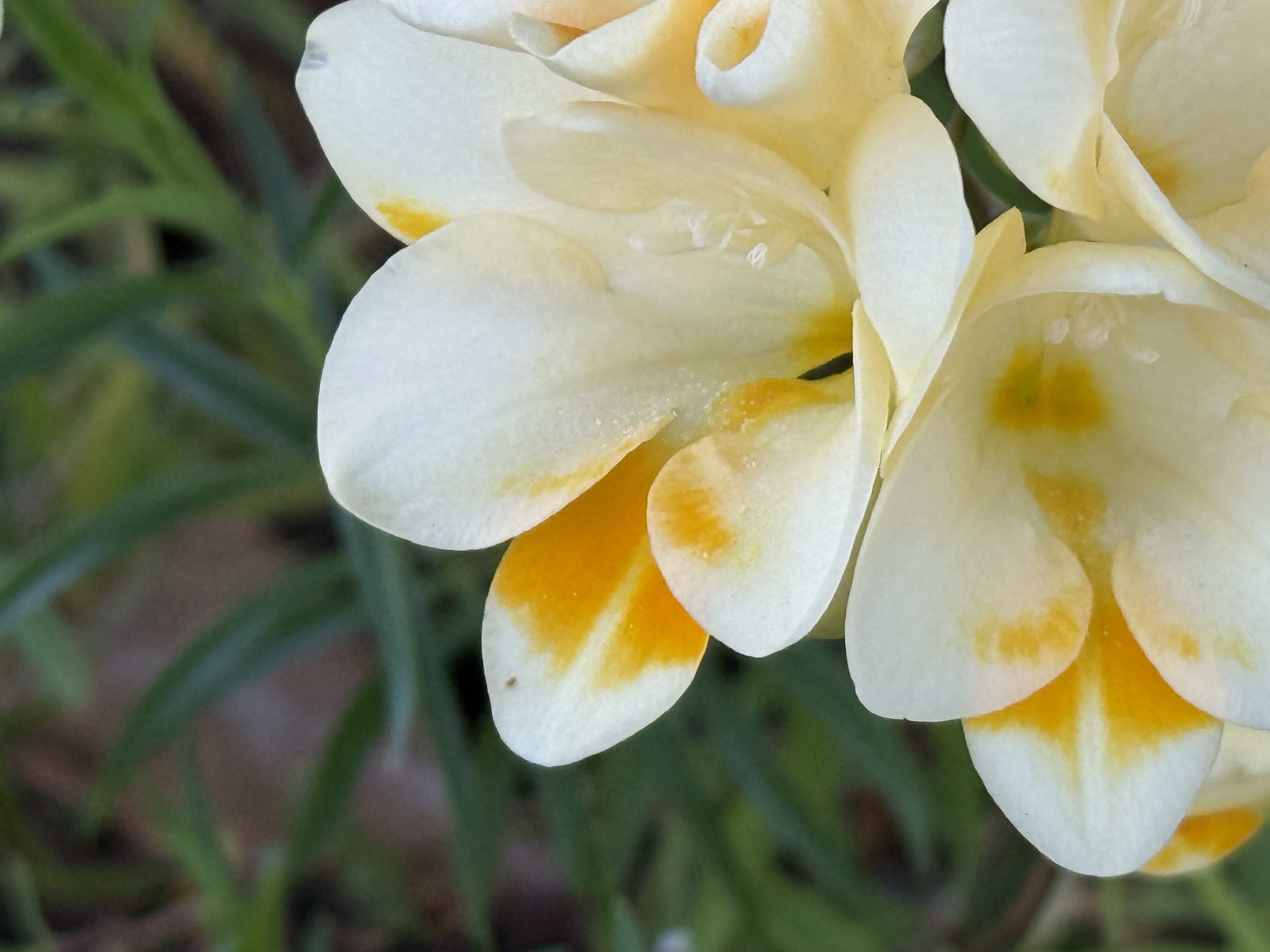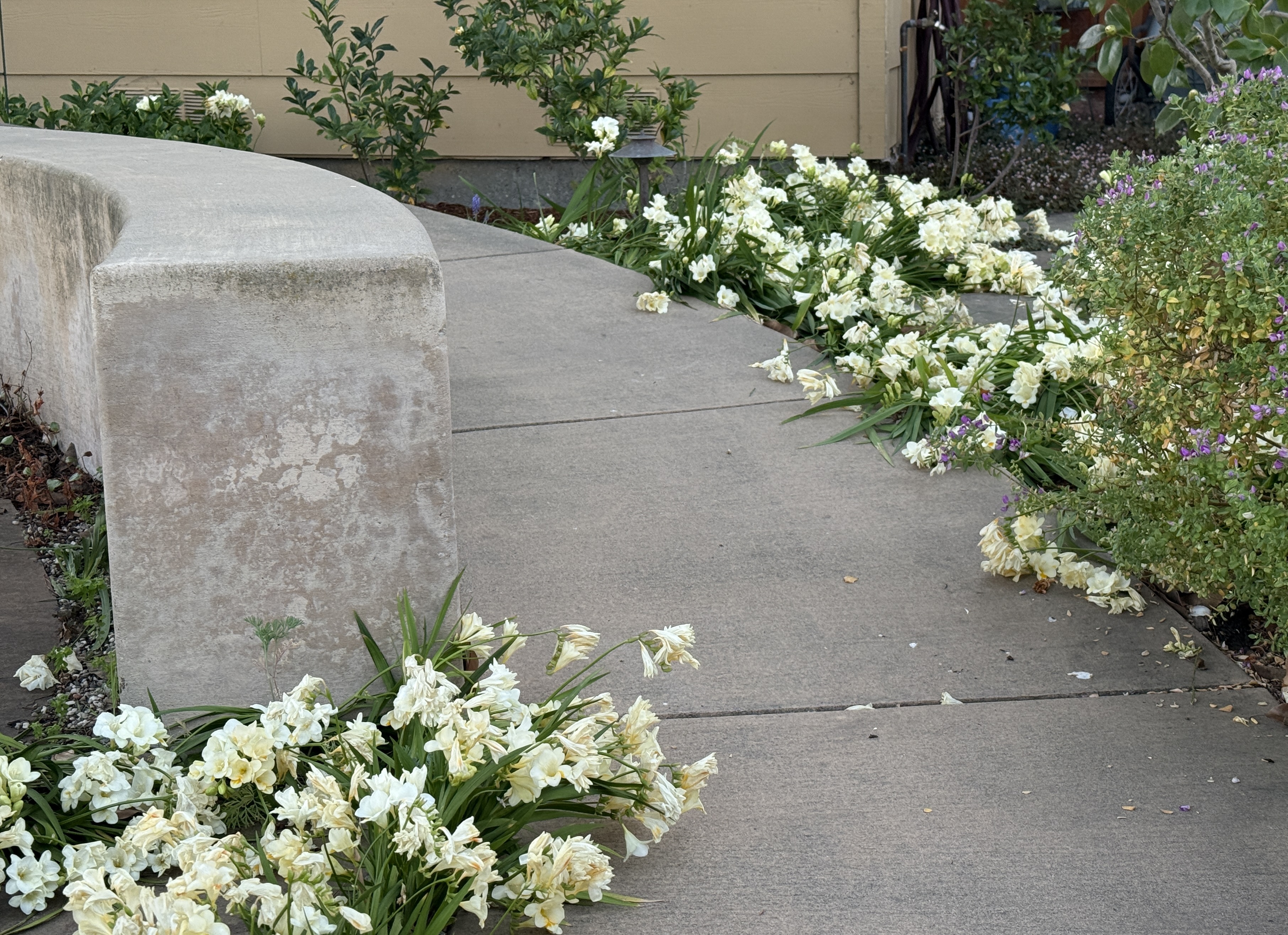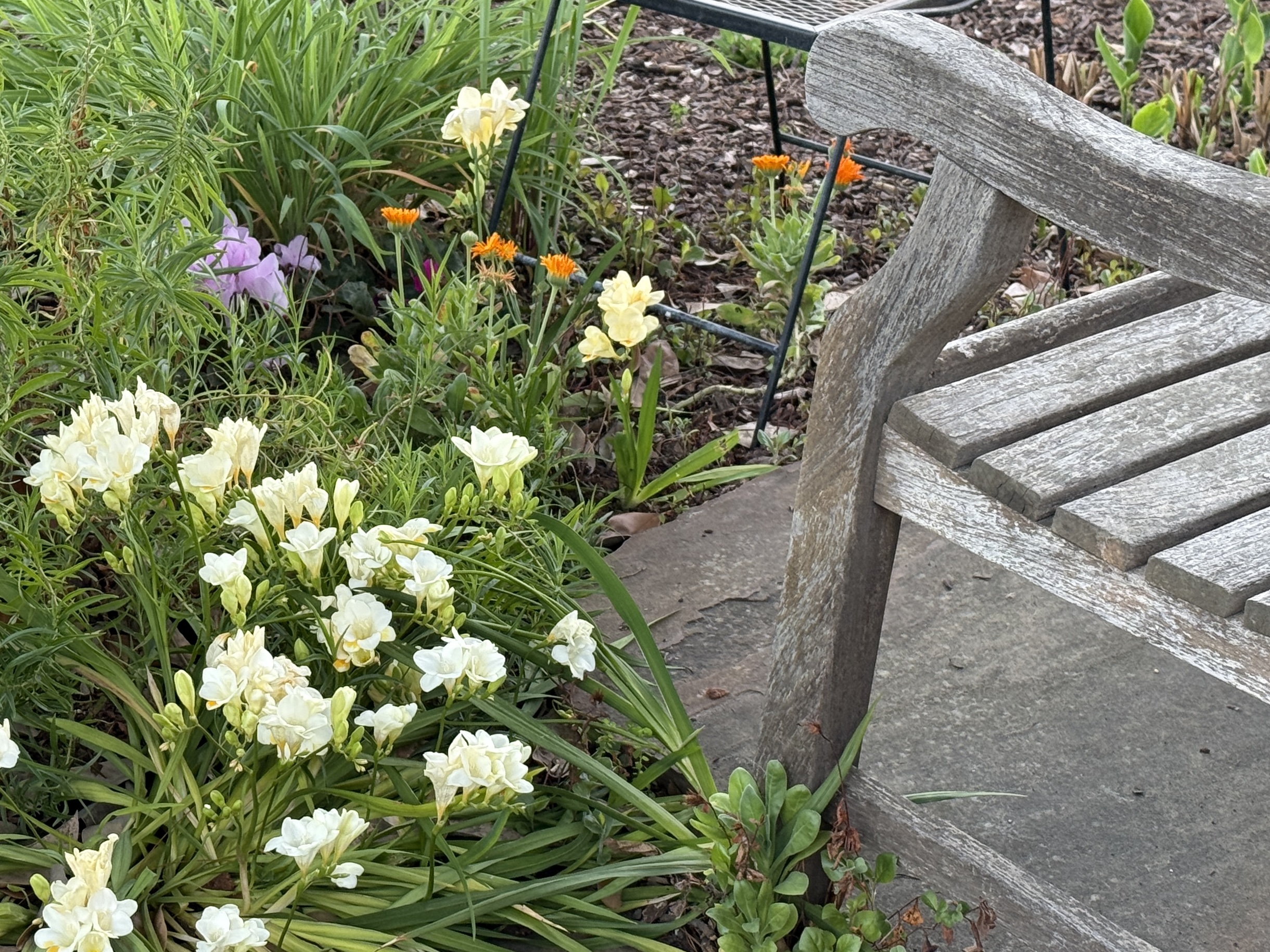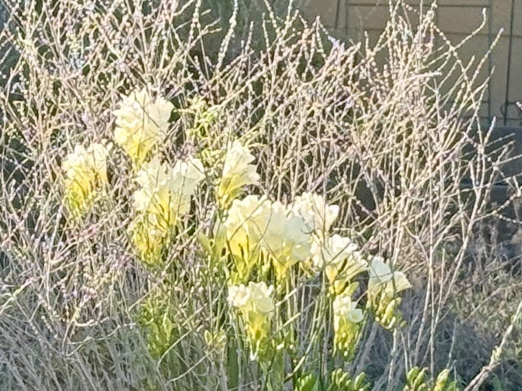 Freesias are growing along the walkway to the front deck, en masse, with others dotting the path to our garden bench and tucked here and there. One of the bulbs planted itself under the Russian sage, and now stands taller than any I’ve seen. I wish you could see it at dusk with the last of the sun streaming through. The photo doesn’t do it justice.