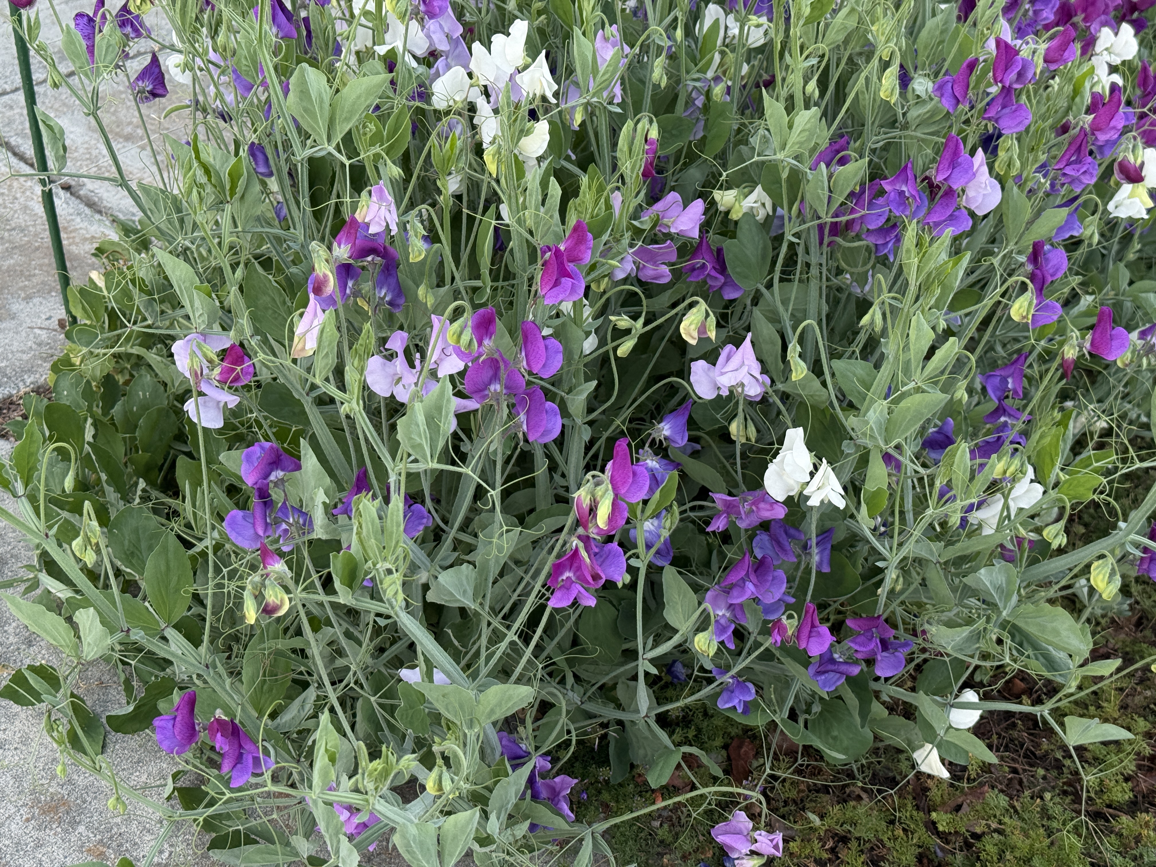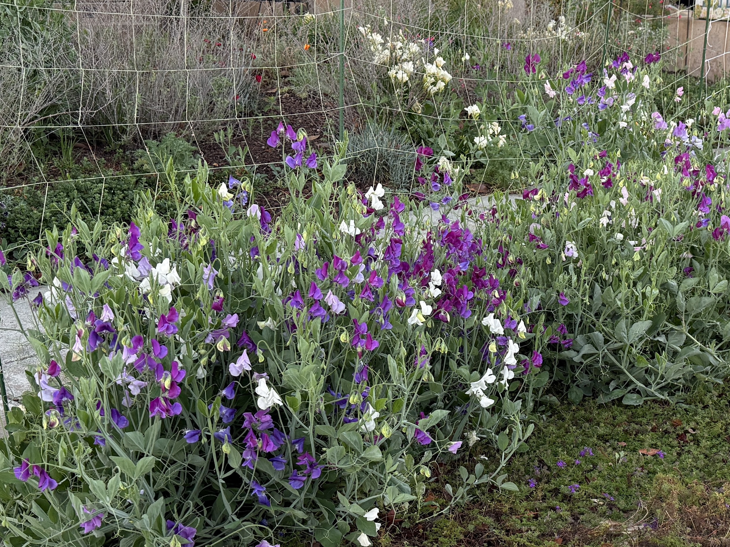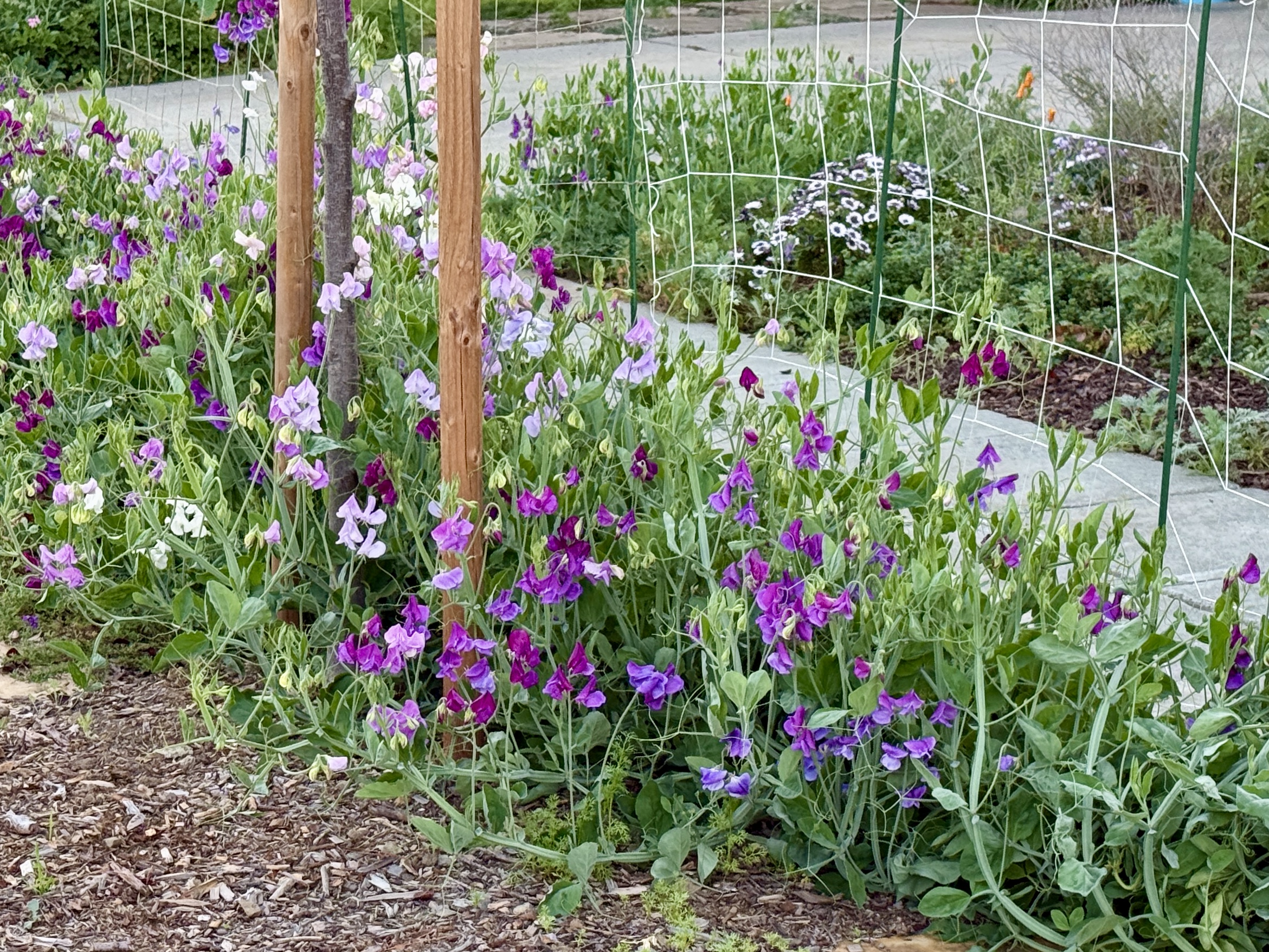 Mike helped me place netting and garden stakes along the curb to keep the sweet peas off the sidewalk. The vines rapid growth ads to the wafting scents in the air. Of all the flowers I’ve grown over the years, those lovely, fragrant, soft-petaled sweet peas charm passers-by. They evoke a gentle nostalgia.