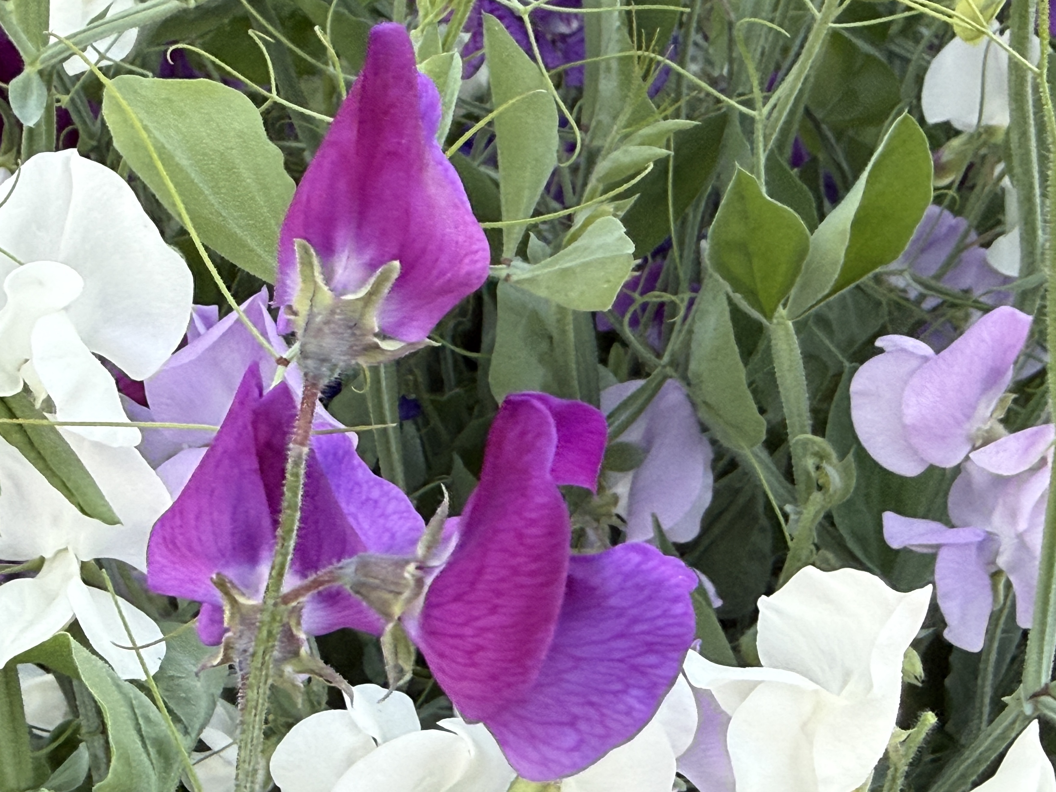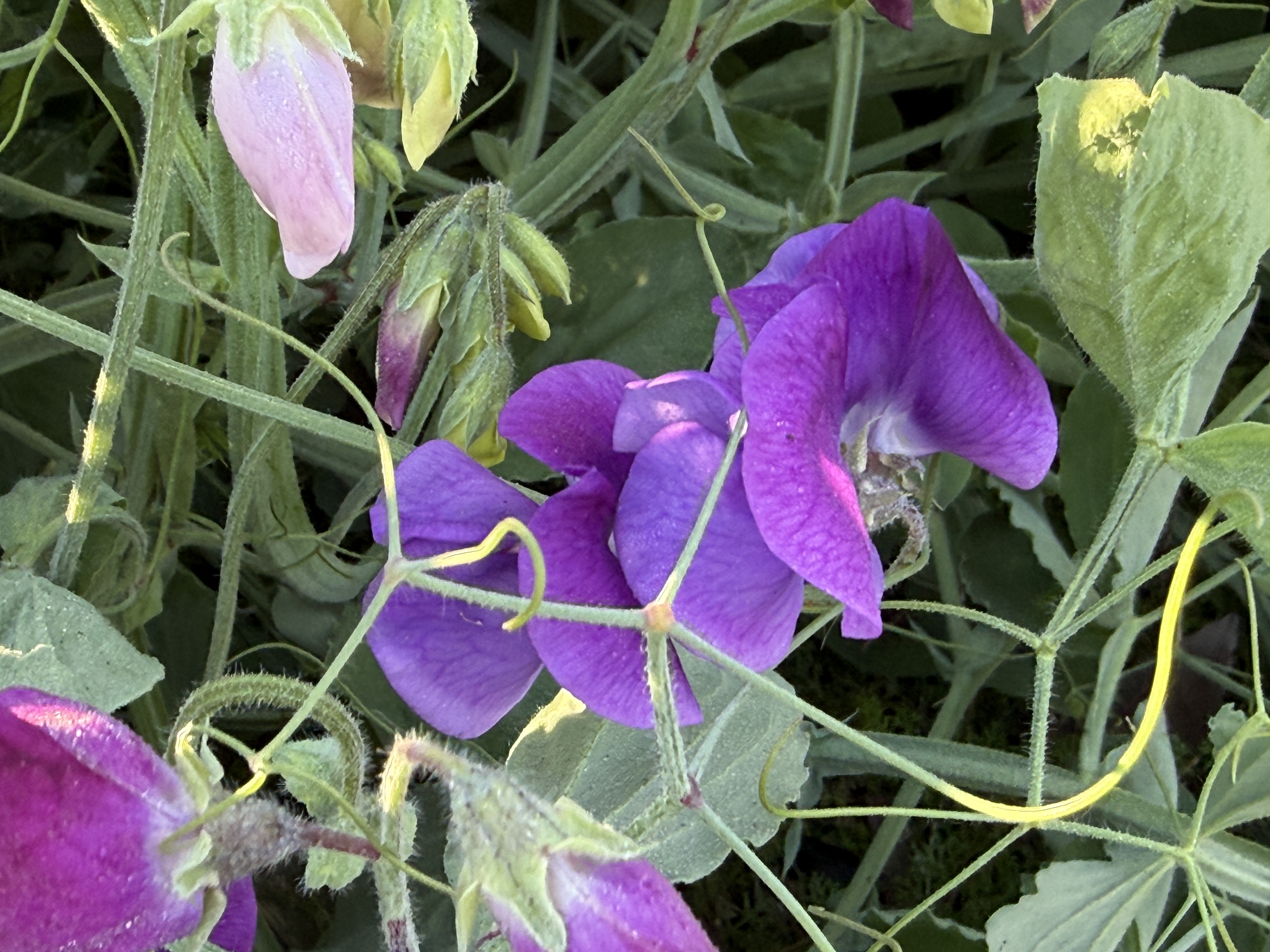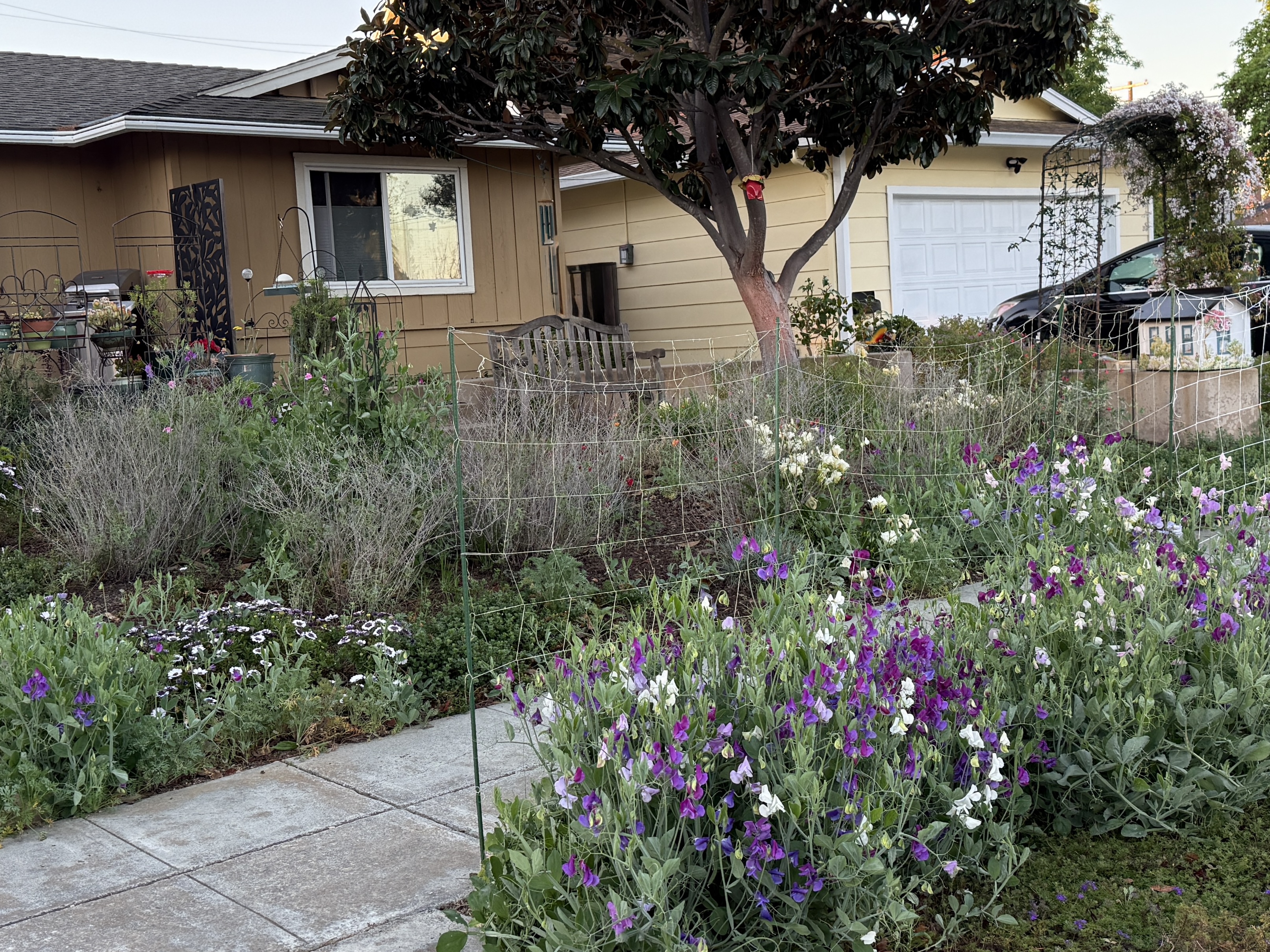 Mike helped me place netting and garden stakes along the curb to keep the sweet peas off the sidewalk. The vines rapid growth ads to the wafting scents in the air. Of all the flowers I’ve grown over the years, those lovely, fragrant, soft-petaled sweet peas charm passers-by. They evoke a gentle nostalgia.