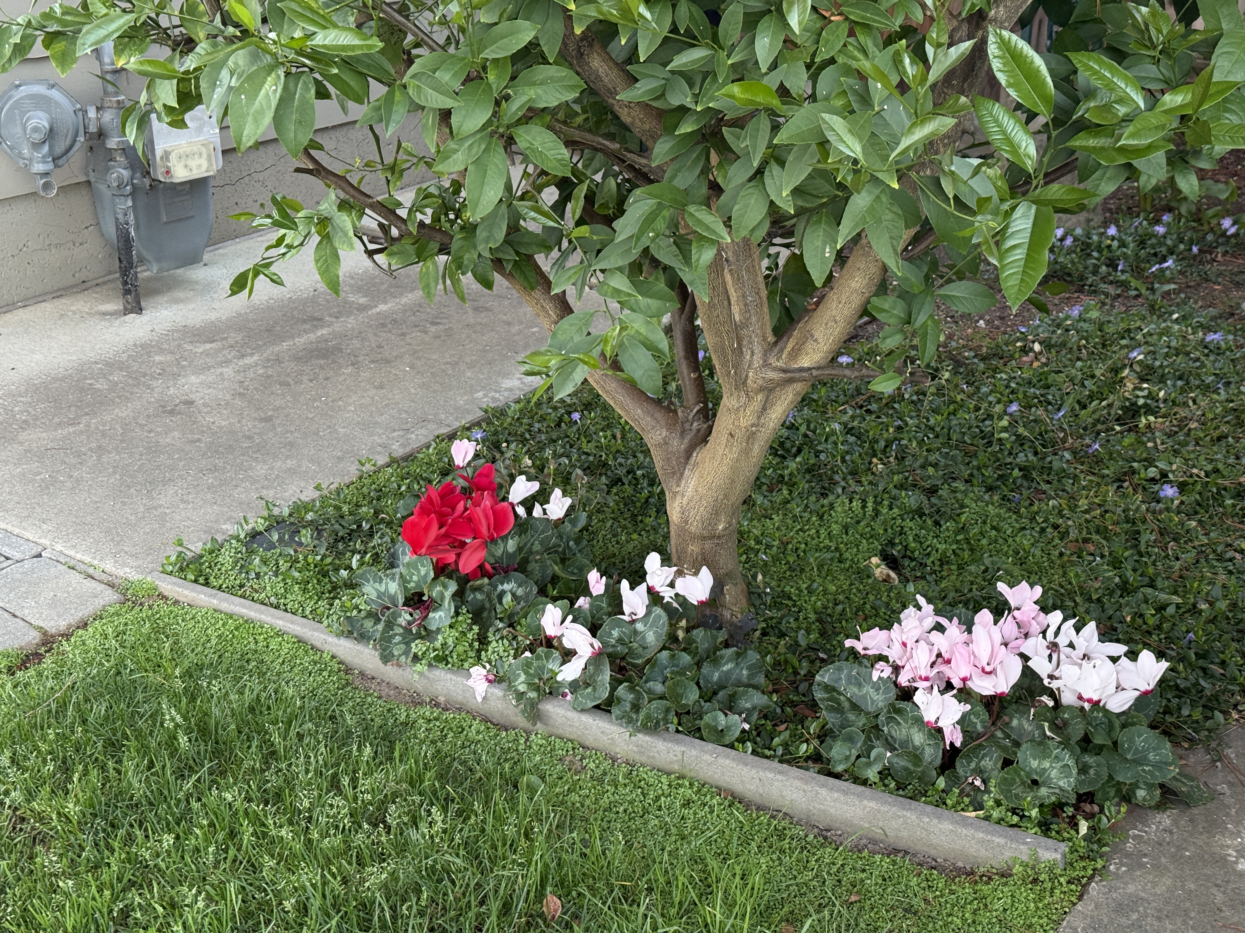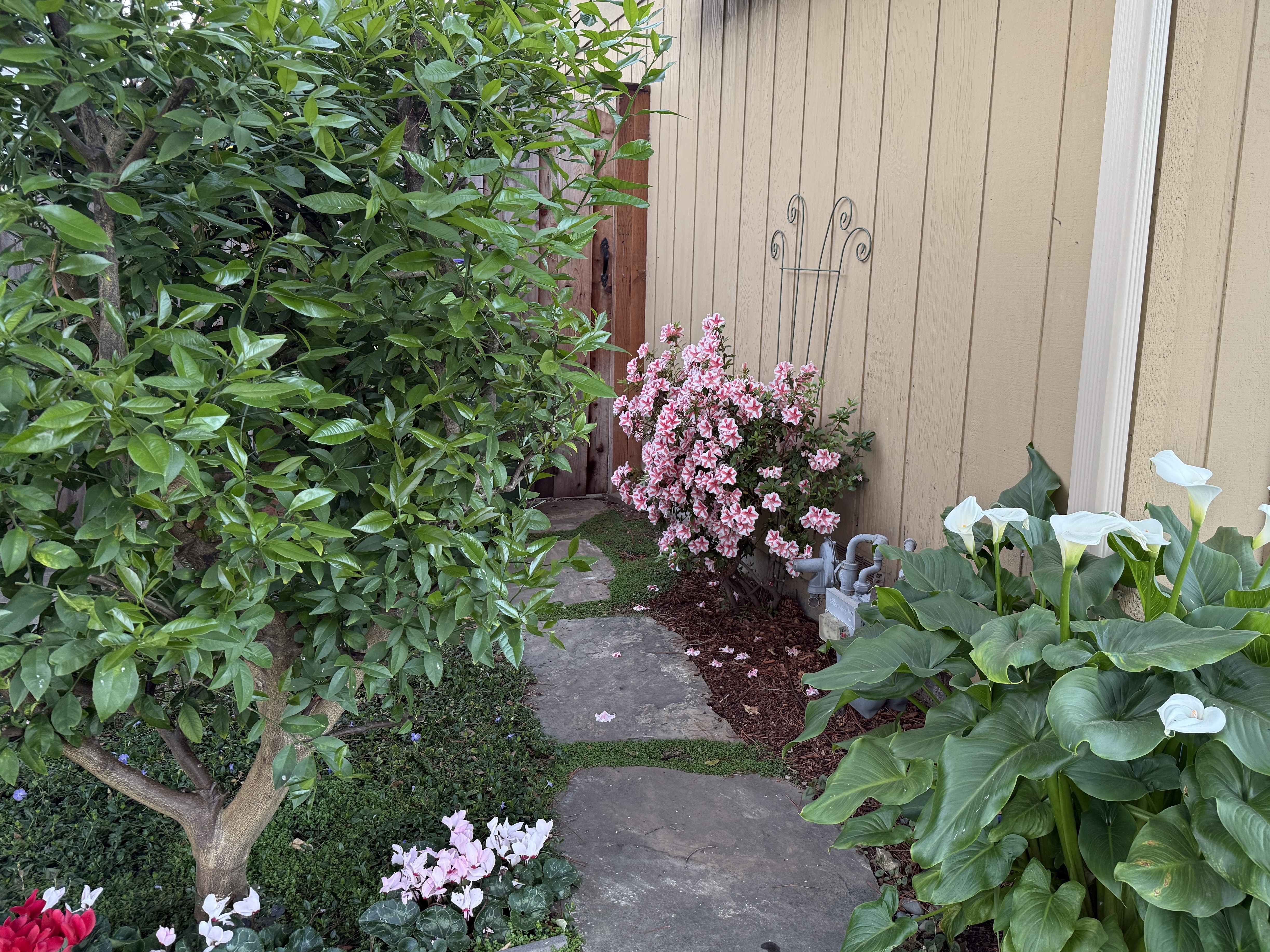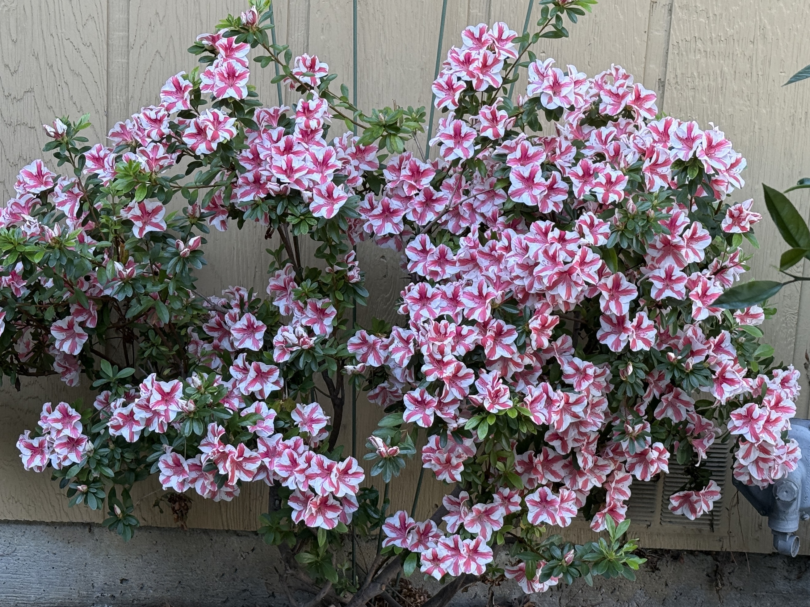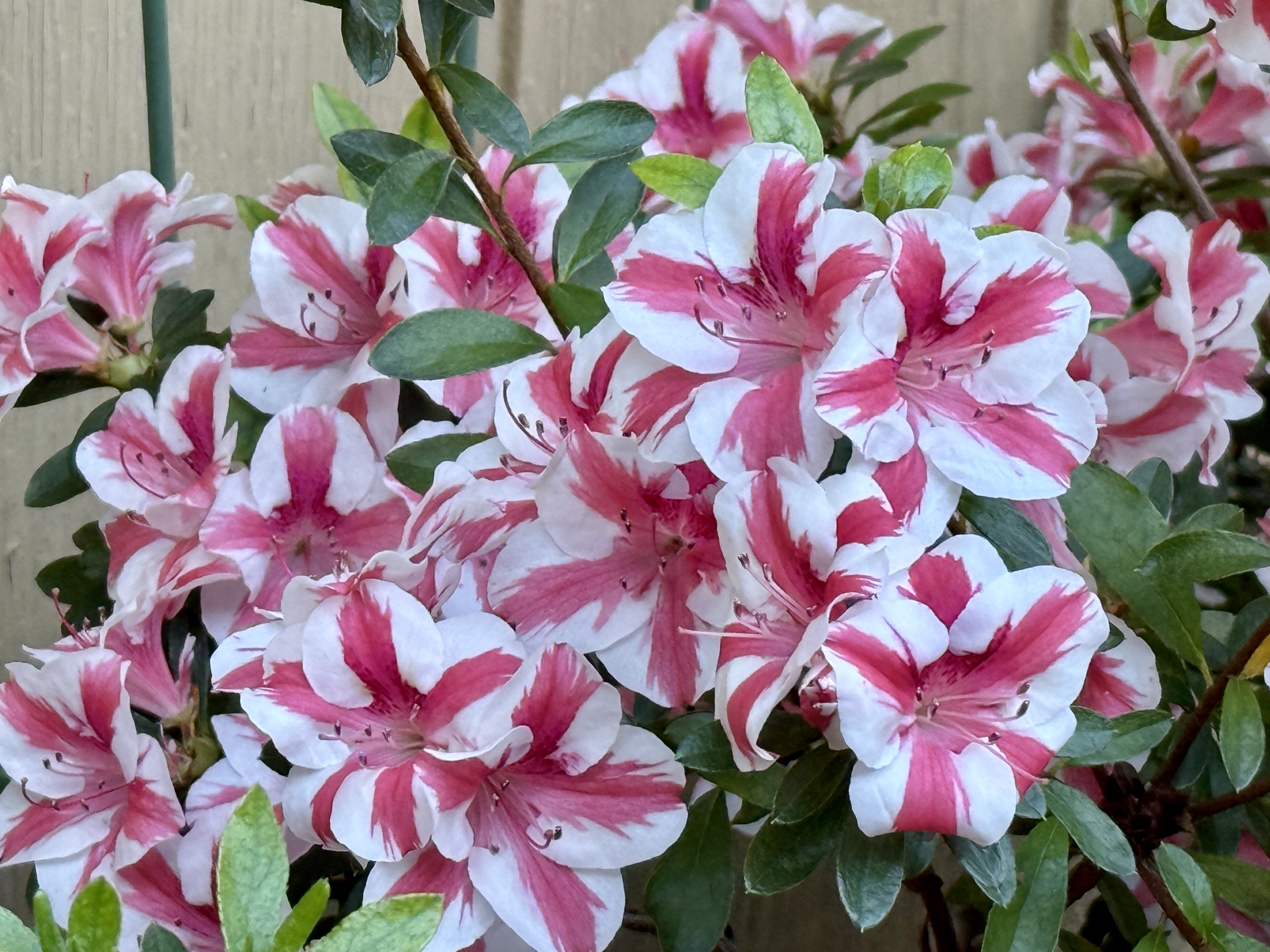 I forget how spectacular this candy-cane azalea is this time of year. You have to walk around the side of the house to see it, nestled against the wall of our garage. I trim the azalea once a year after it blooms to keep it from over-taking the space. It remains healthy, but instead of a round shape, it’s wide and flat.