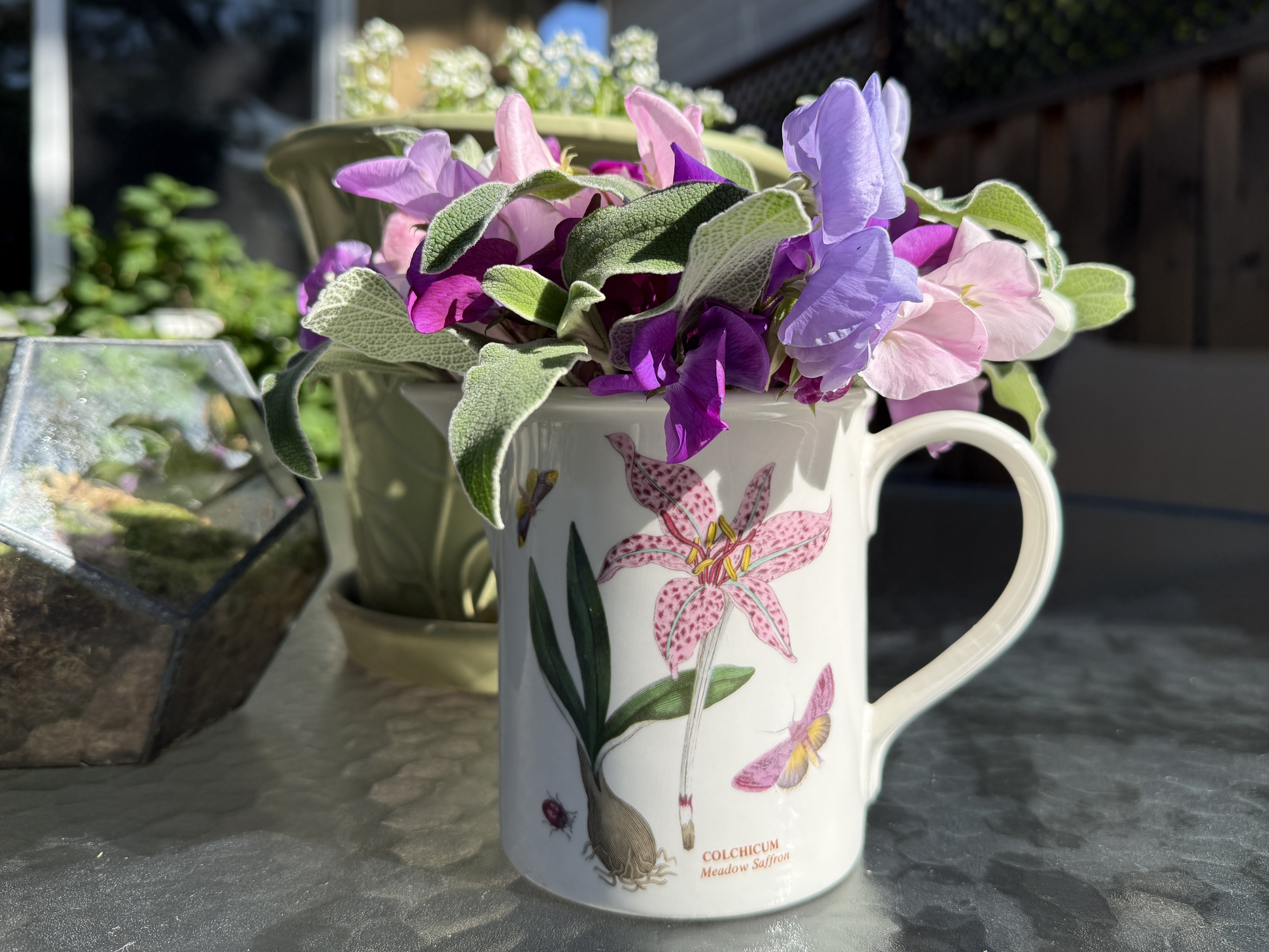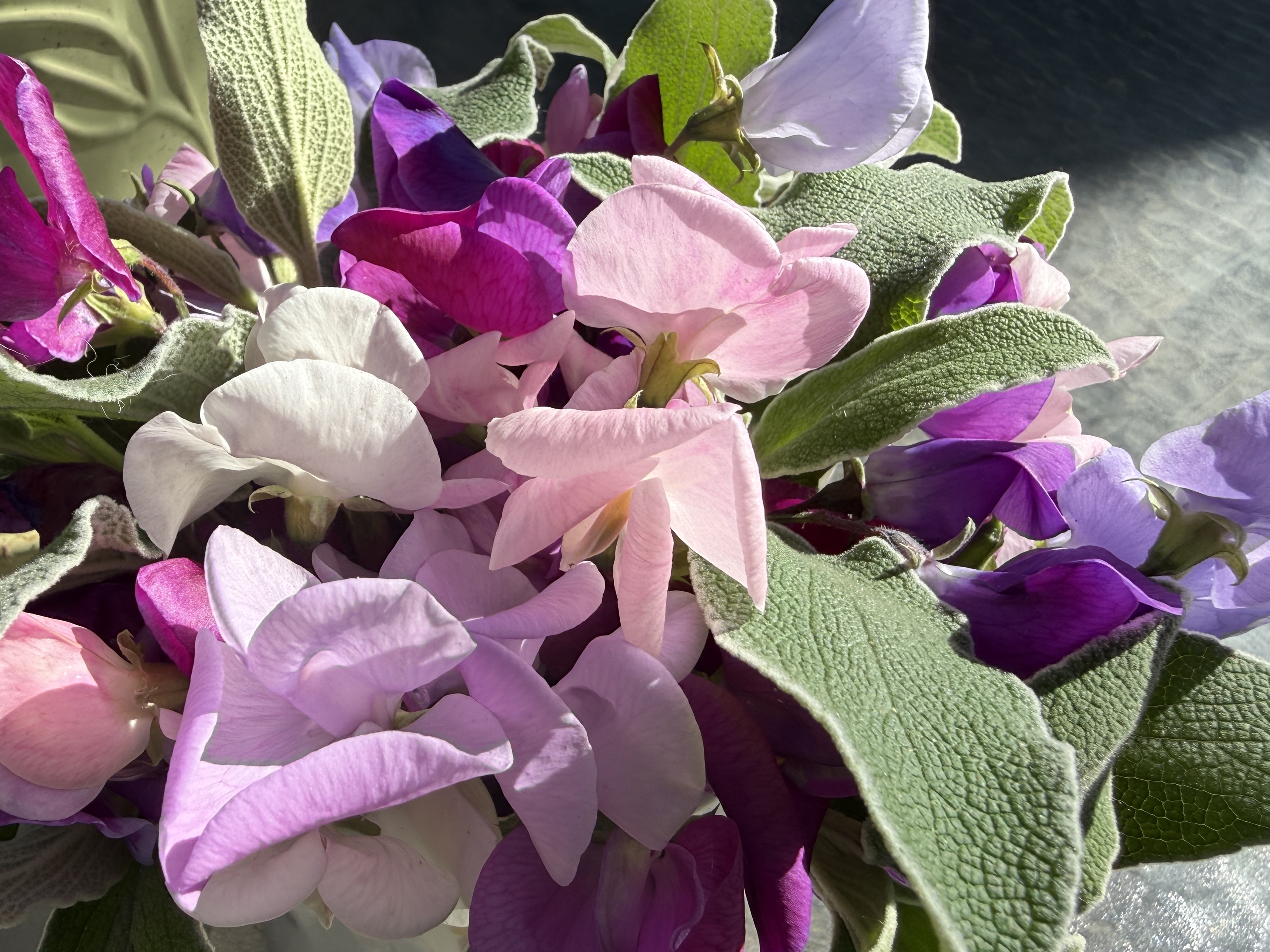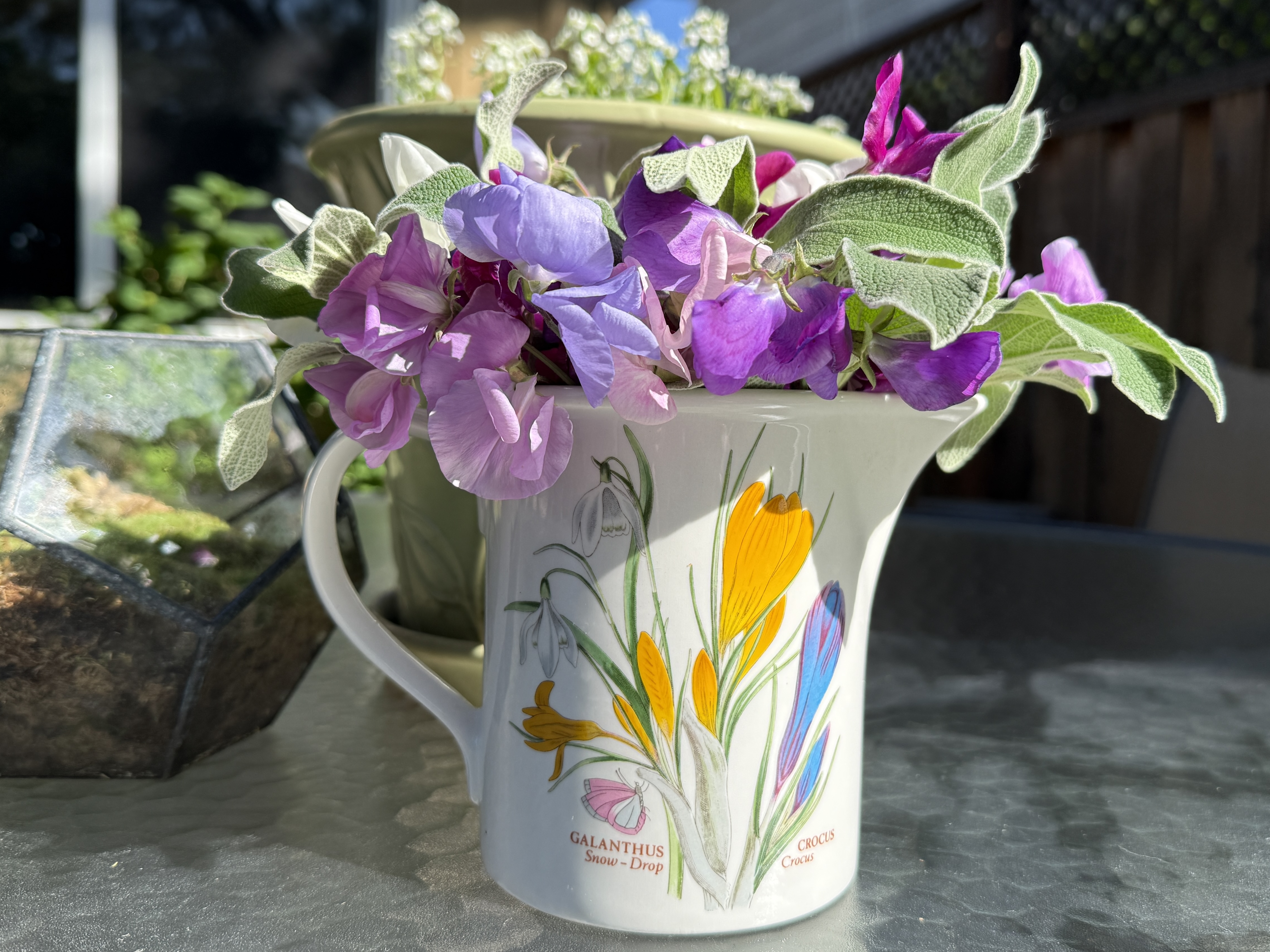 It’s not intended for flowers, but that’s never stopped me. My research indicates it’s a “Garden Drum Jug Pitcher from their Portmieren Botanical Garden collection,” but around here it will now be known as a flower vase. I’ve filled it with sweet peas (Lathyrus odoratus) and sprigs of Jerusalem sage (Phlomis fruticosa), a soft-leafed beauty from the garden.
