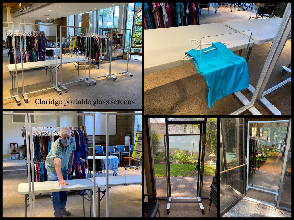 We created a volunteer position called the gatekeeper. I set up three stations allowing our volunteers to be indoors, one in the lobby and two more along the building’s back. A handyman repaired the walkway for safe passage, we purchased two large canopies and created a sheltered area along the back of our building, once a church. Claridge donated five rolling, tempered-glass screens, which we use as a barrier between volunteers and clients.
