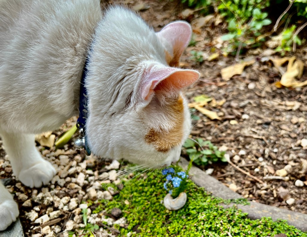 Satisfied with my tiny vase, I snapped a few photos, then let “Bubba” have a sniff so you could see the true scale of the snail. Snail shell, that is.