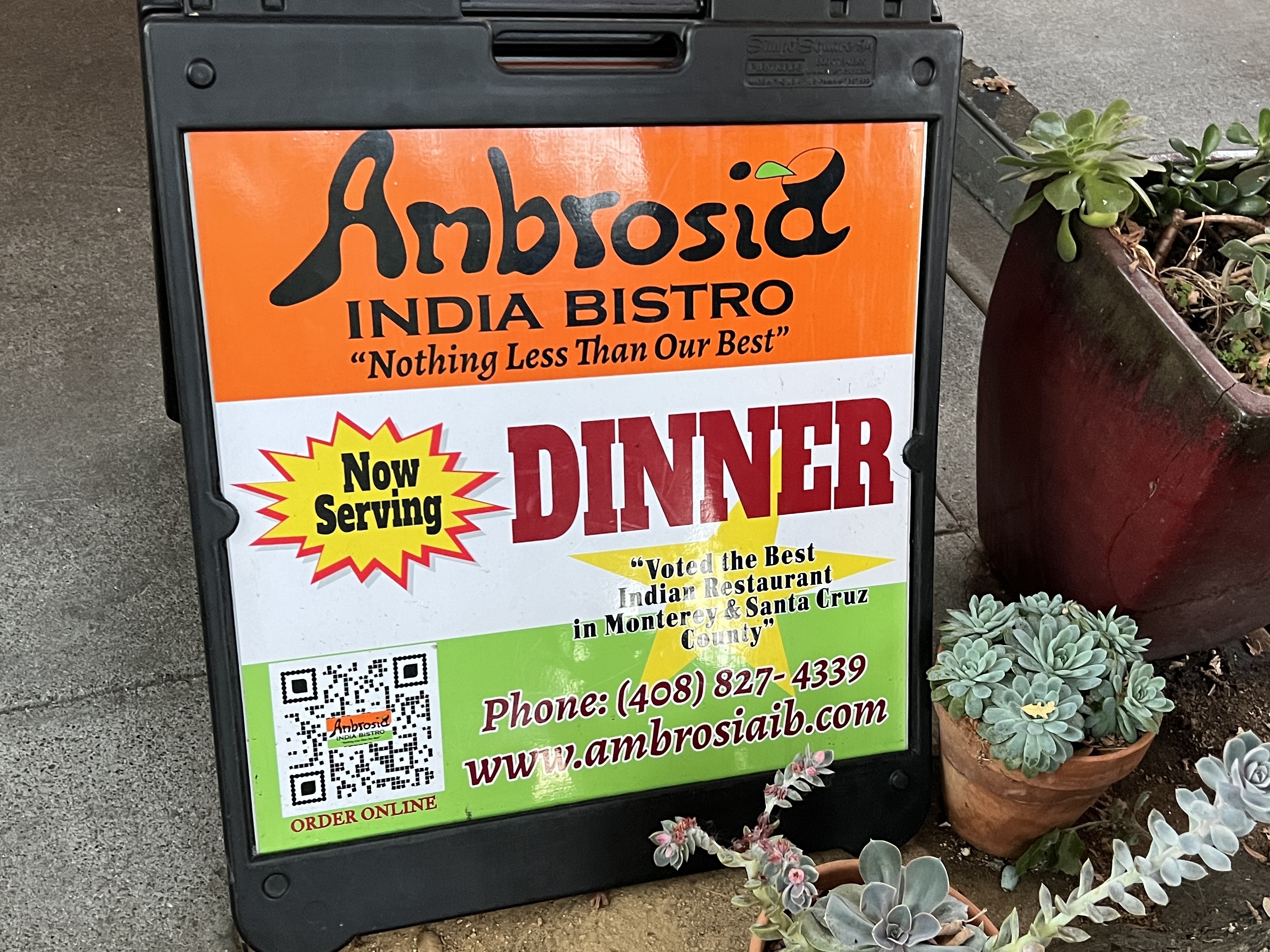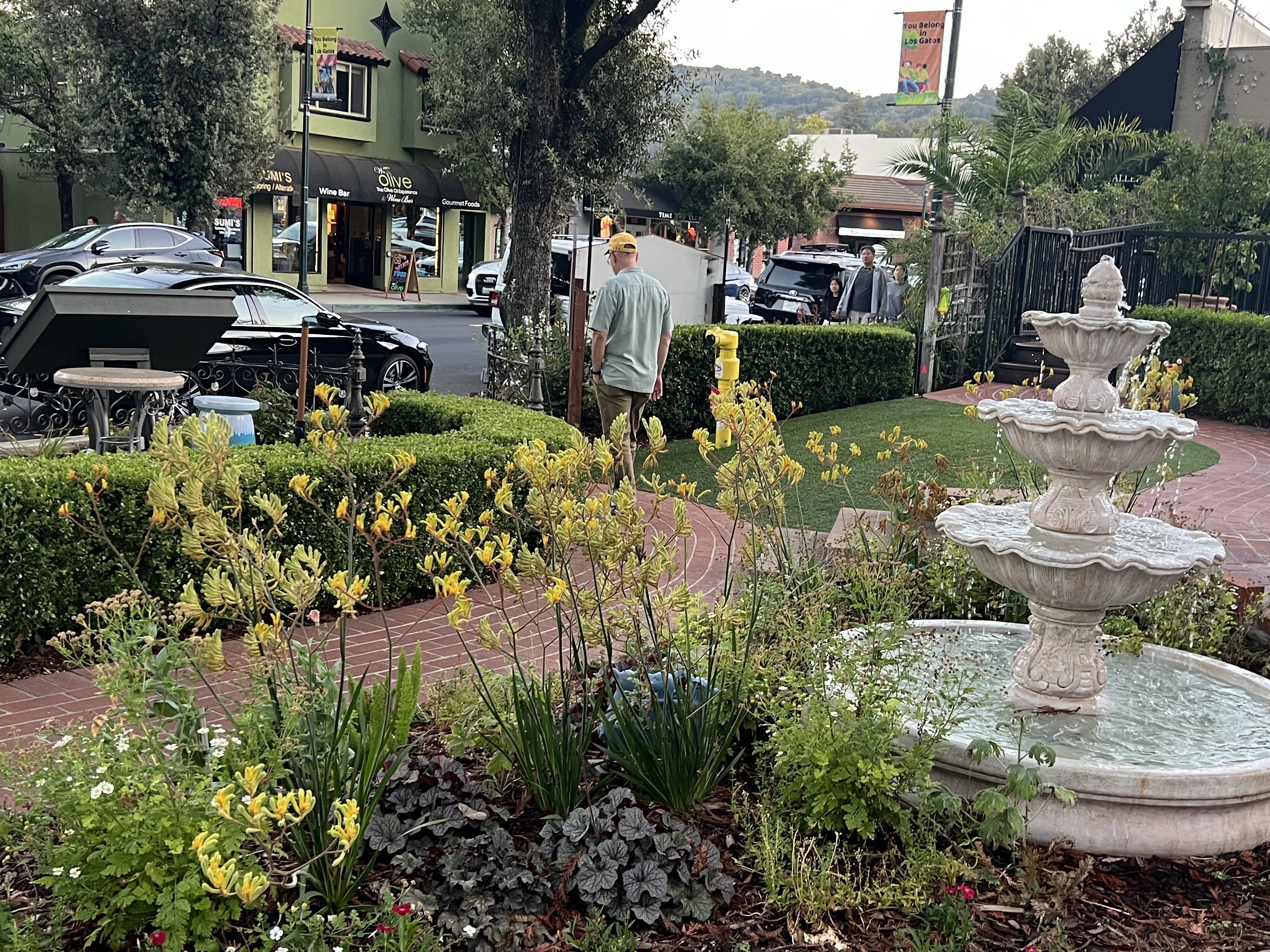After a tasty meal of Caprese, bruschetta, pasta, and dessert, we walked around the downtown area, enjoying what I’ve always loved about Los Gatos: flowers and plants in shop doorways, redwood trees in unexpected places, interesting shop windows, and sandwich boards announcing wares along the sidewalks. The town is full of charm.