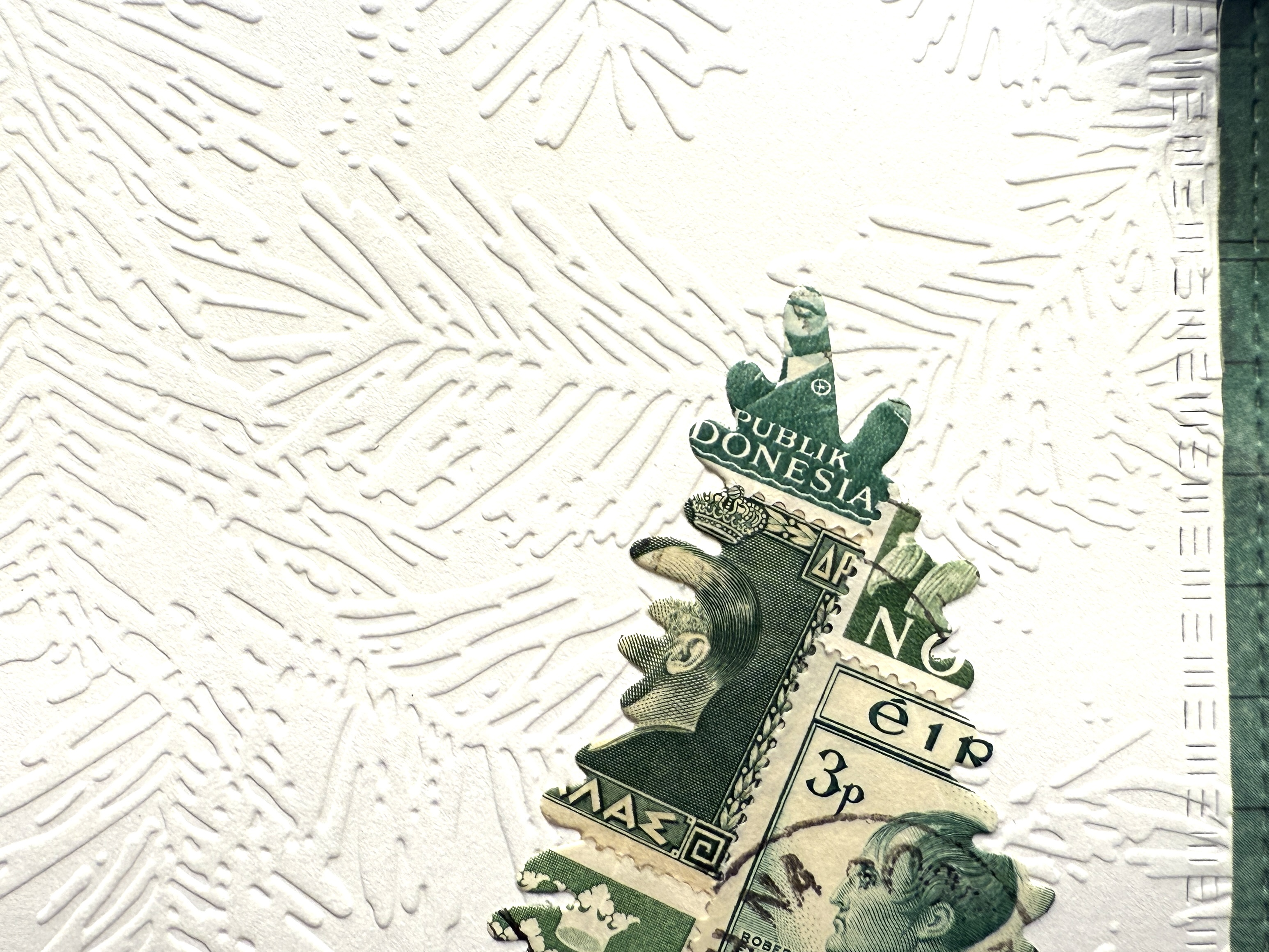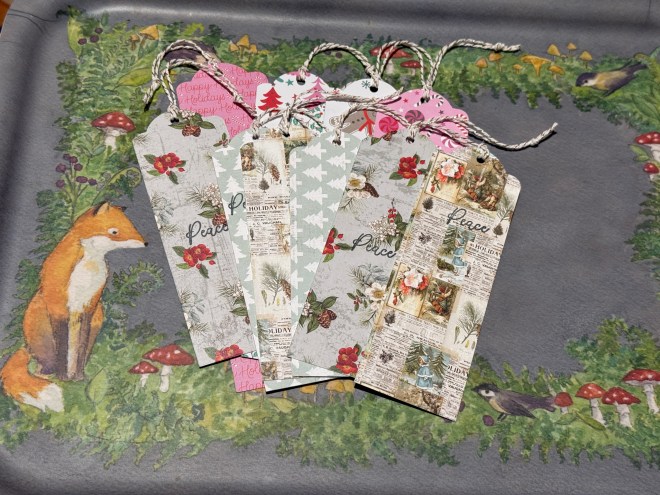 The off-cuts of Christmas paper make the perfect bookmark, and since I regularly replenish a supply in our Little Free Library, I enjoyed using these scraps with some seasonal flair. There is very little “make” here, just a punch at the top threaded with a bit of cord. I stamped “Peace” in black ink, a sentiment worth sharing, and one that offers hope.