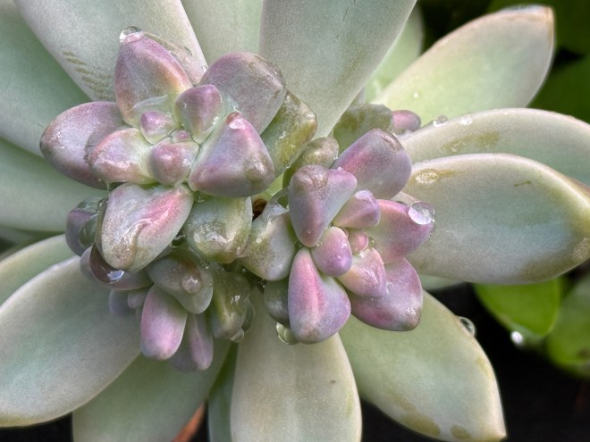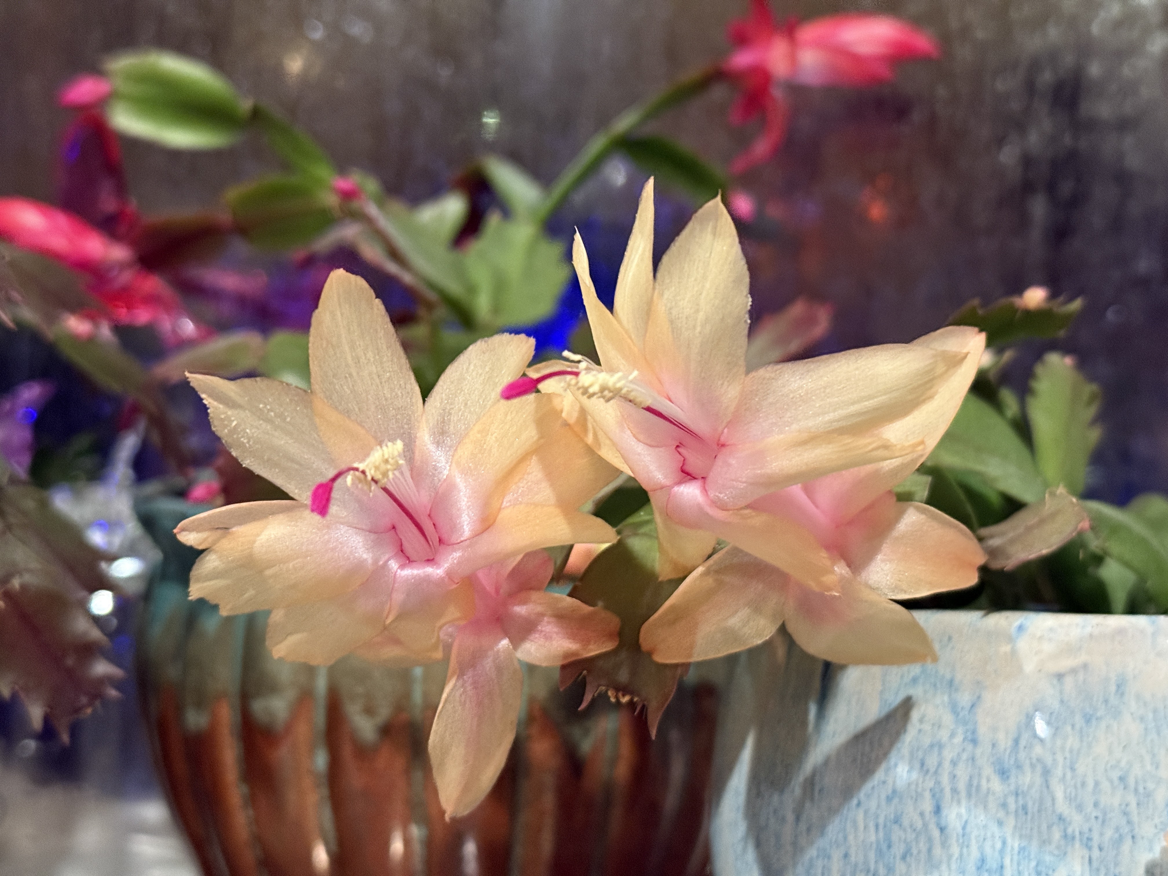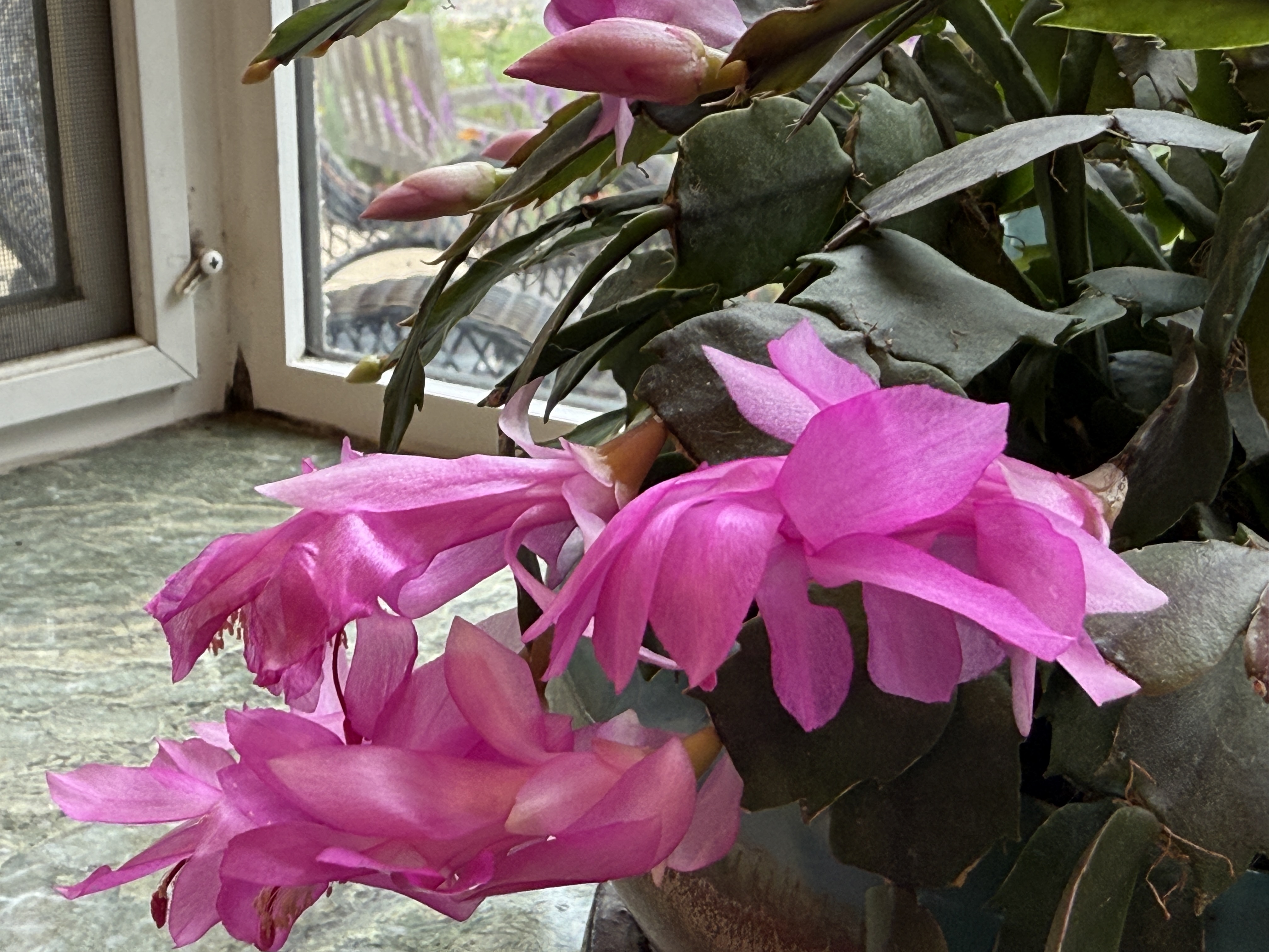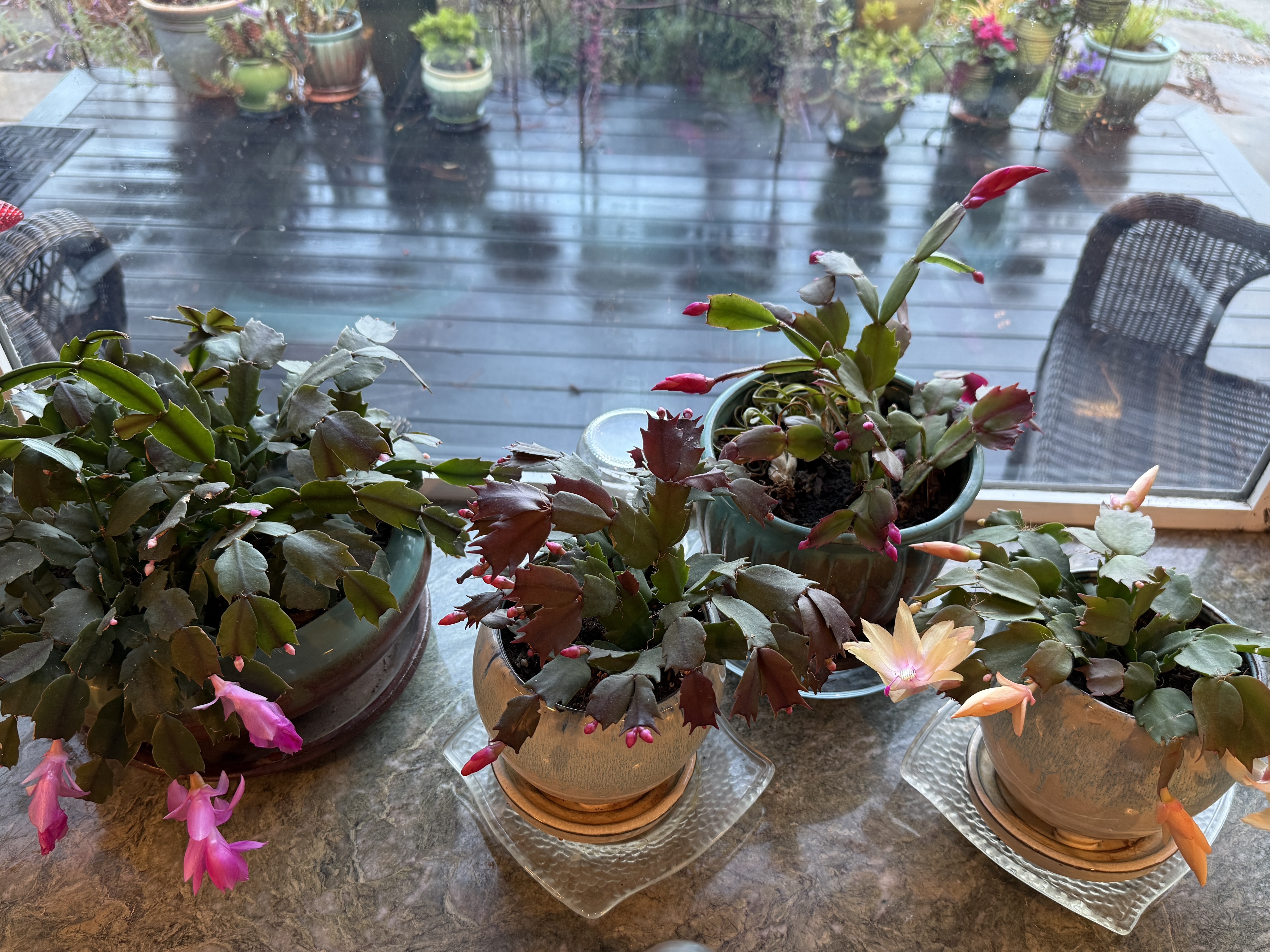 The last of the pinks is a collection of Christmas cacti that live on the kitchen counter under diffused light. I can’t remember a time when they bloomed so profusely. They are a balm for the weary soul.