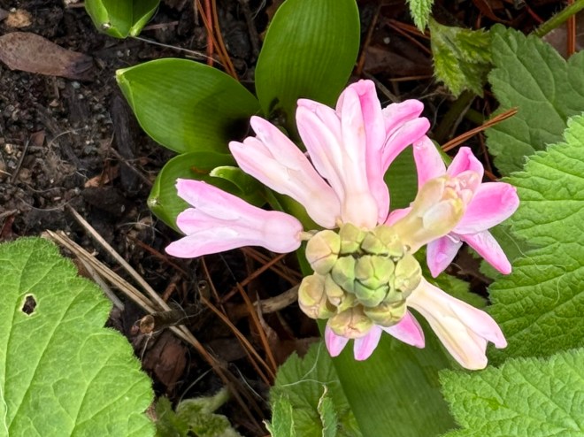 At the corner of our patio, the first of the pink hyacinths is up, with more pinks and purples to follow. They remind me of Mom, who once gave each of us one for Christmas along with a glass bulb-growing vase. I still remember what a thrill it was seeing that fragrant flower emerge from the top, but being able to see the roots, too.