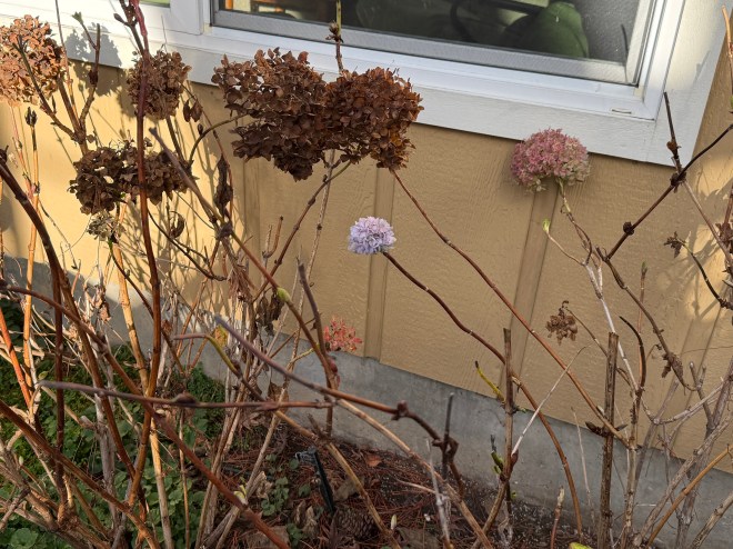 An impromptu browse through the garden this morning revealed unexpected pinks and purples on a dark and drizzly day. December rain cleared most of the remaining foliage on the dormant hydrangea bringing into focus a pair of out-of-season blooms blushing against the grey sky. These garden anomalies make me smile.