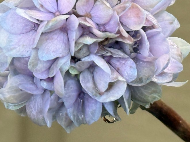 Raindrops linger amid the lavenders, pinks, and blues of this small, January hydrangea