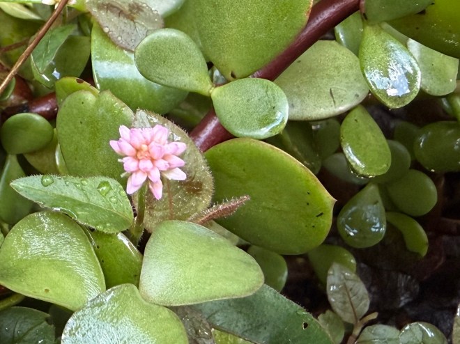 By now, I was on a mission to find anything remotely pink or purple in the garden. Everything smells wonderful after a rain, so I took my time and turned up one more, this tiny flowering ground cover that self-seeds as it pleases, and has done so for thirty years.