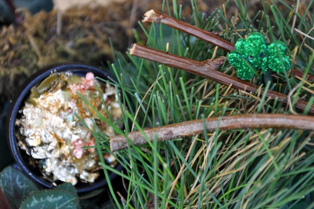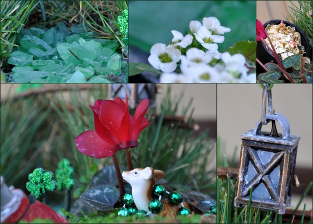 Buddha sits under a tree of Lemon Thyme, with Alyssum on each side. I carpeted the rest of the garden in cool Soleirolia soleirolii also known as baby tears. Other than the boulder-sized stones, the rest of the items came from my fairy garden stash.
