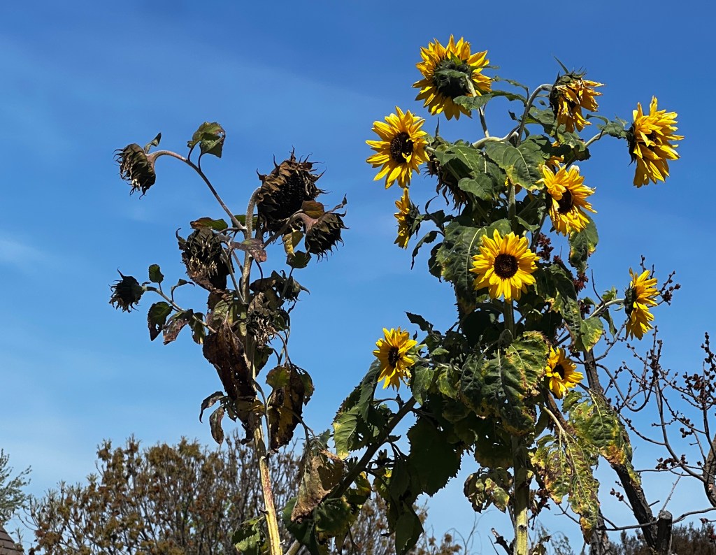 Sunflower seeds are like chocolate for squirrels. To my amazement, ‘Mammoth Sunflowers’ self-seeded in January. That’s never happened before, or if a seedling should arrive out of season, it perishes post haste.