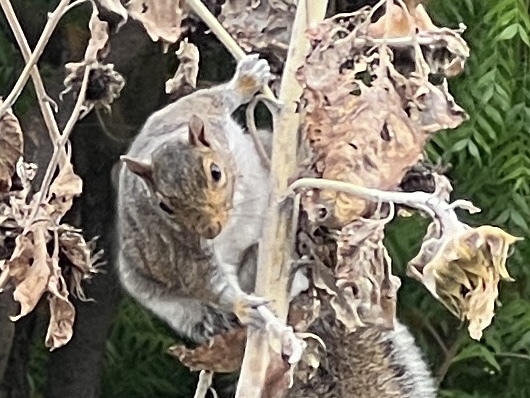 I finally spotted a squirrel enjoying the long-awaited sunflower seeds. Squirrel-watching is quite entertaining.