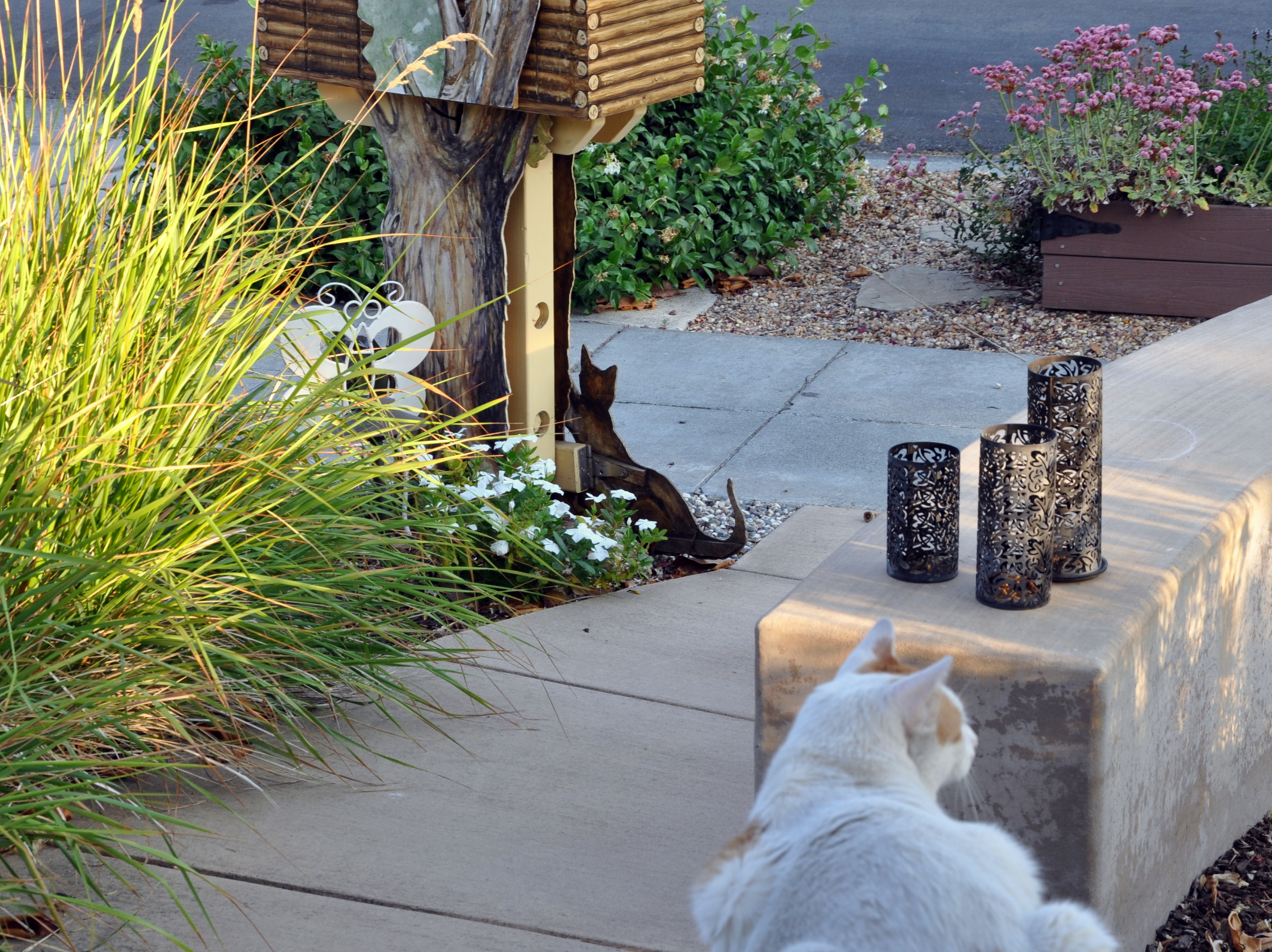 I love this shot of Mouse the cat with the Little Free Library cat silhouette in the foreground. Tall native grasses, left, and pink Scabiosa in the curb garden.