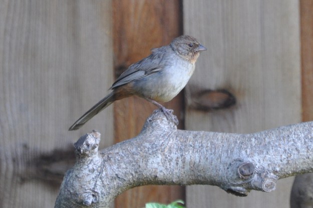 The bird tracked my movements, then hopped along the fence toward the orange tree, and finally on to the neighboring fence. She continued the chatter with an ever-watchful eye.
