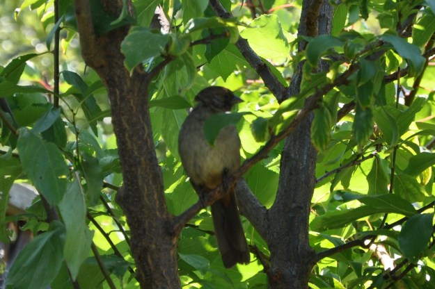 I took several pics of the bird resting in the Pittosporum, before she flew away. She soon returned, this time perched in the branches of a fruit tree.