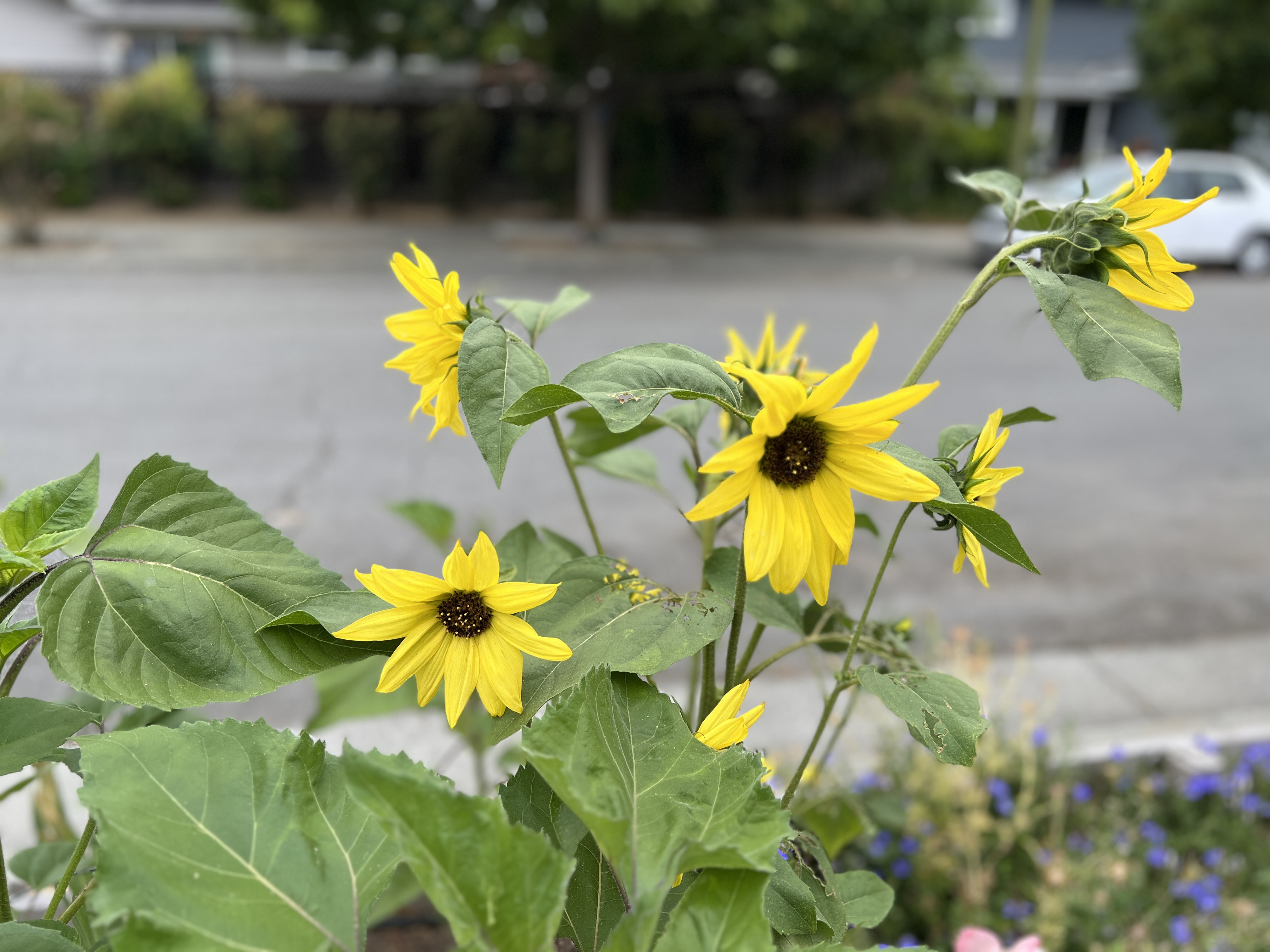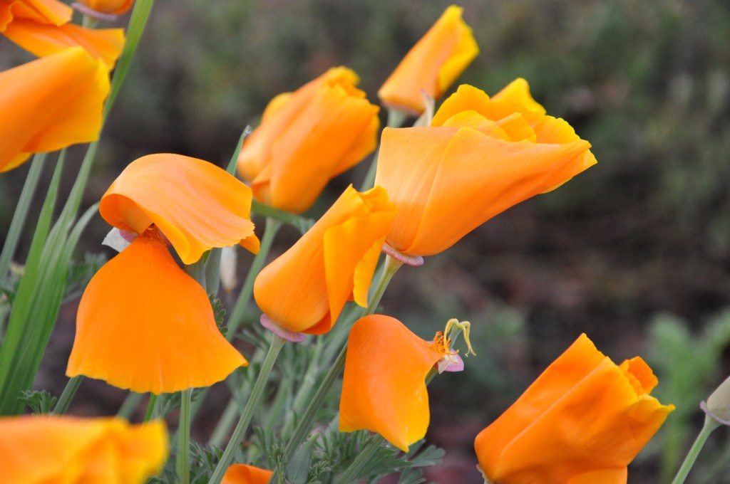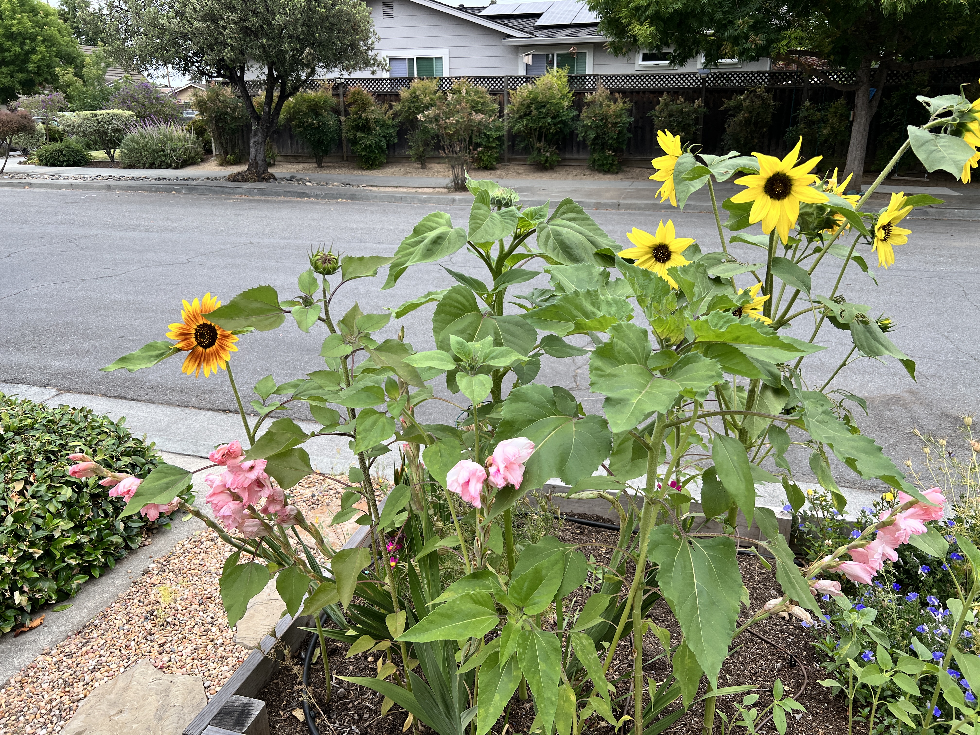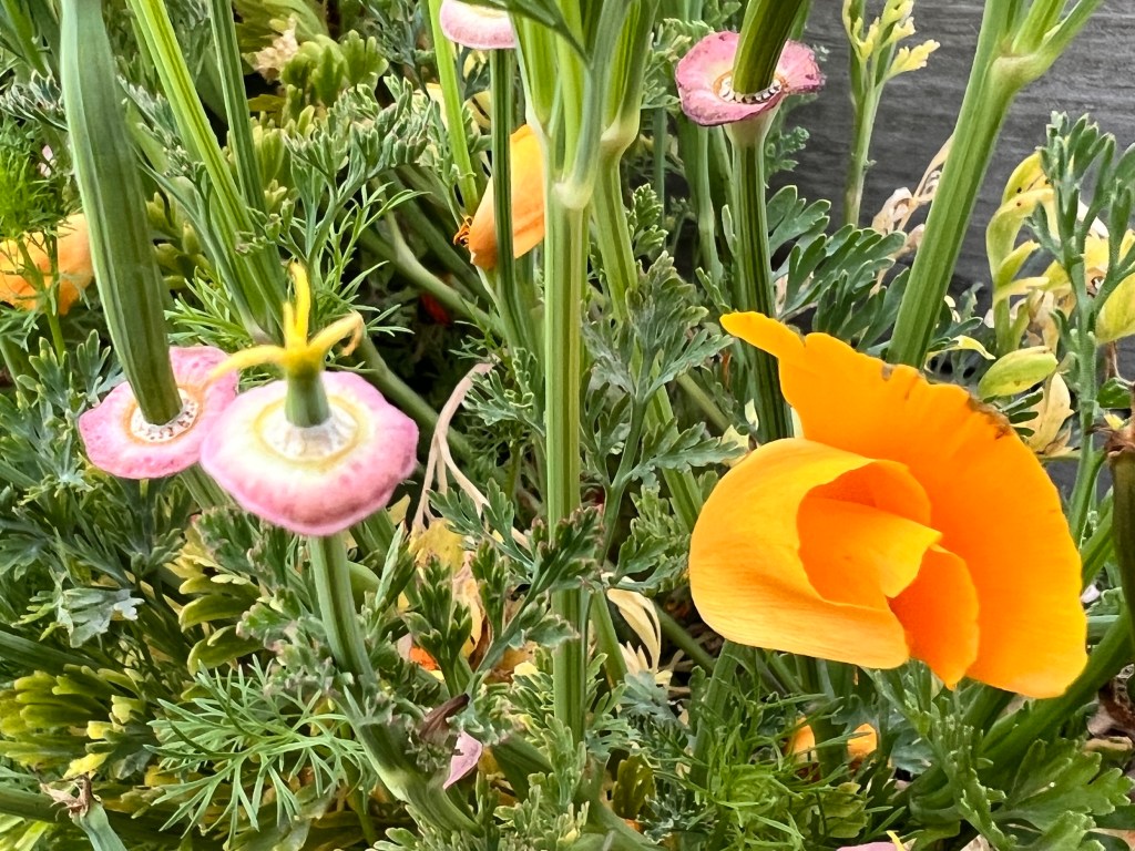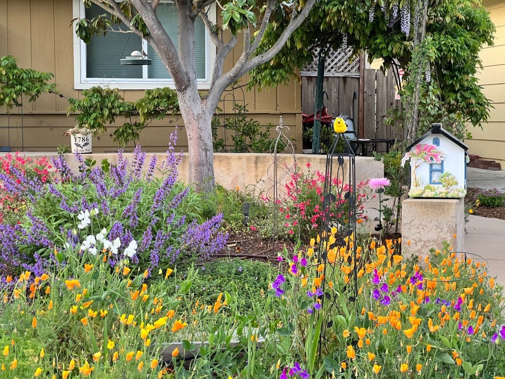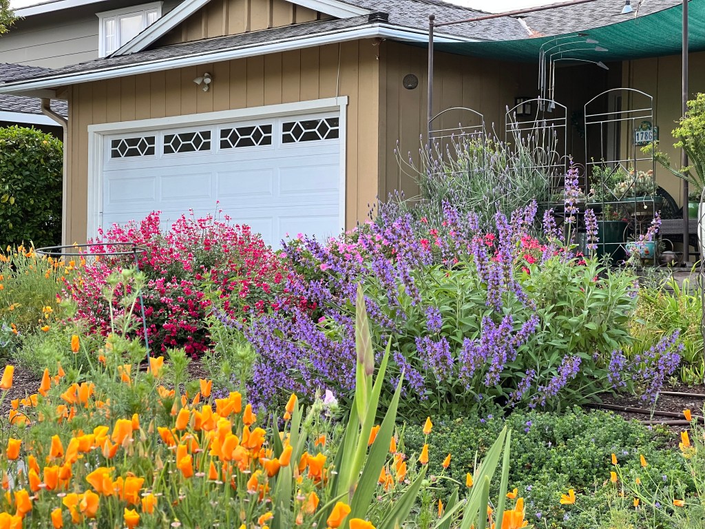 California poppies spread across the walkway this year, with several taking up residence around the curb garden and along the drive. They, too, were first scattered from a packet of seeds.