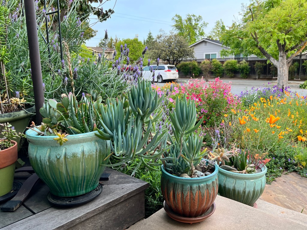 The garden continues to evolve, moving from the manicured lawn and roses we inherited when we bought this house to a garden filled with native and drought-tolerant plants, three mature trees, and a deck lined with succulents instead of thirsty annuals. The slider featur below shows the back garden in 1996 and 2024.