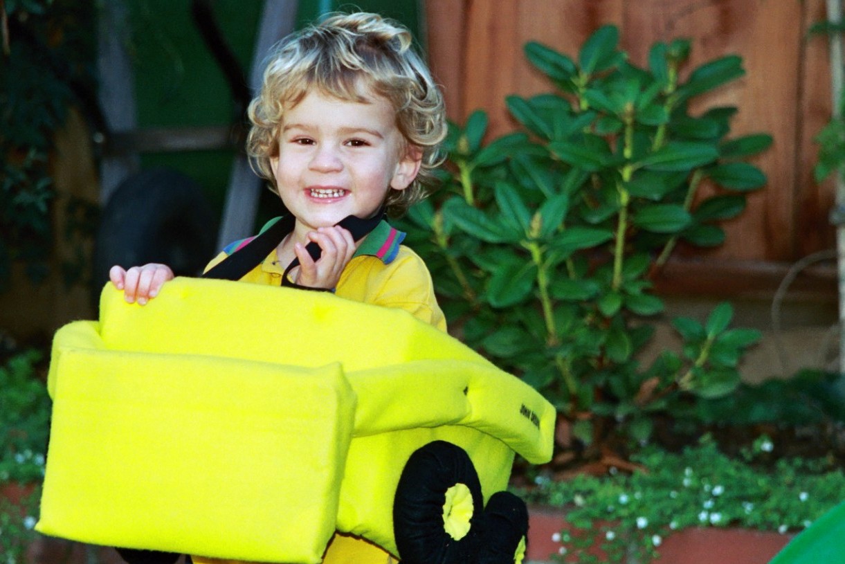 I bought a few pieces of soft foam for the frame and glued it together in a rectangle. I covered the frame with yellow felt, and then added foam wheels. An old, plastic vegetable cutting mat worked well for the “scoop” so if he fell wearing the costume he wouldn’t get hurt. I attached thick, black elastic in a crisscross pattern, much like suspenders. He wore a pair of hand-me-down coveralls underneath.