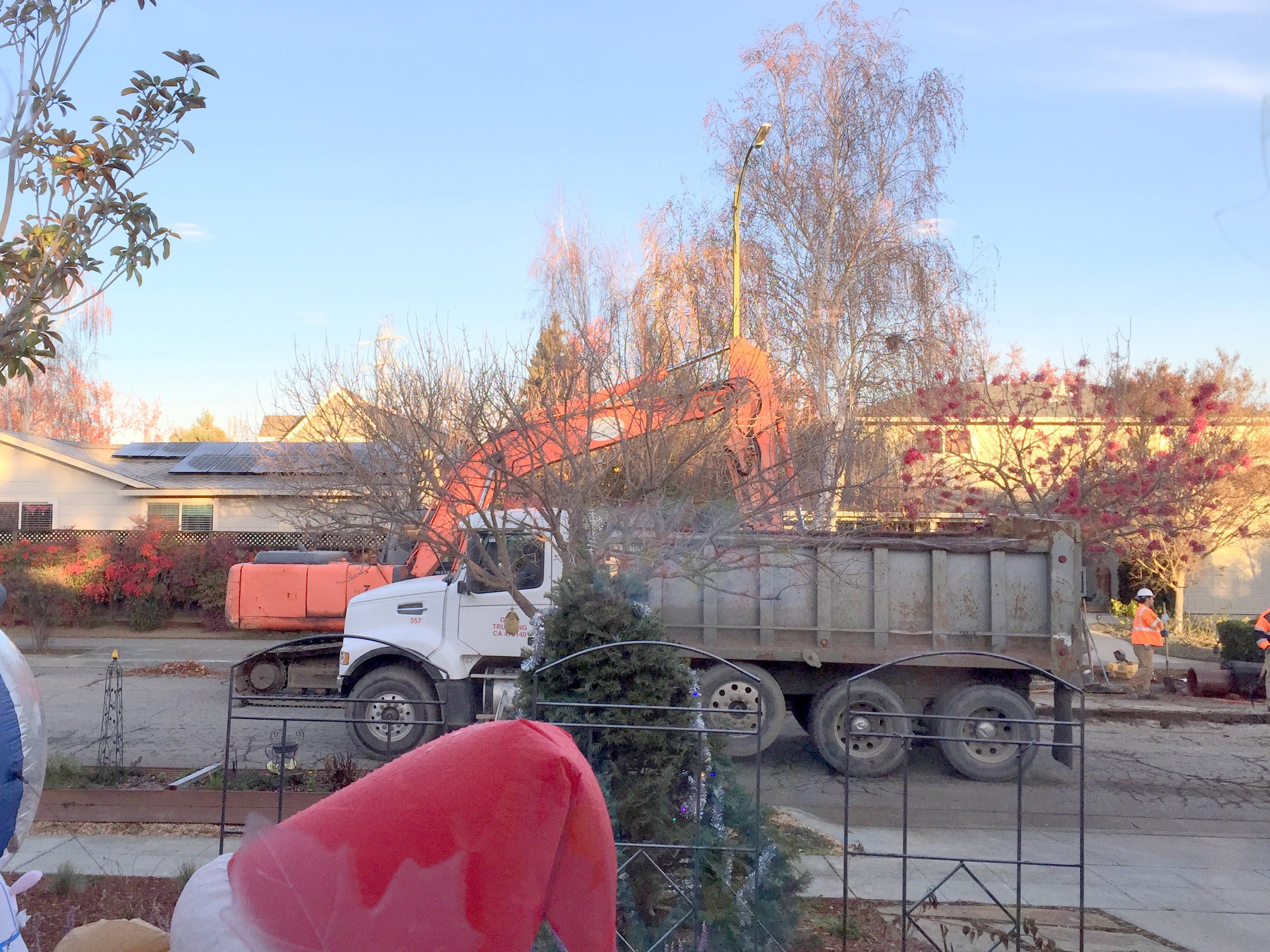 Crews from the city are installing new sewage pipe down the center of our street. They’ve been working their way through the neighborhood over the past several weeks. For the next few days they’ll be right outside our door.