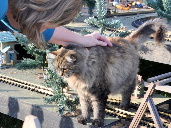 Kitty stretched and yawned, then marched across the train tracks for a closer view of me. Far from being skittish, he was happy for a bit of TLC.