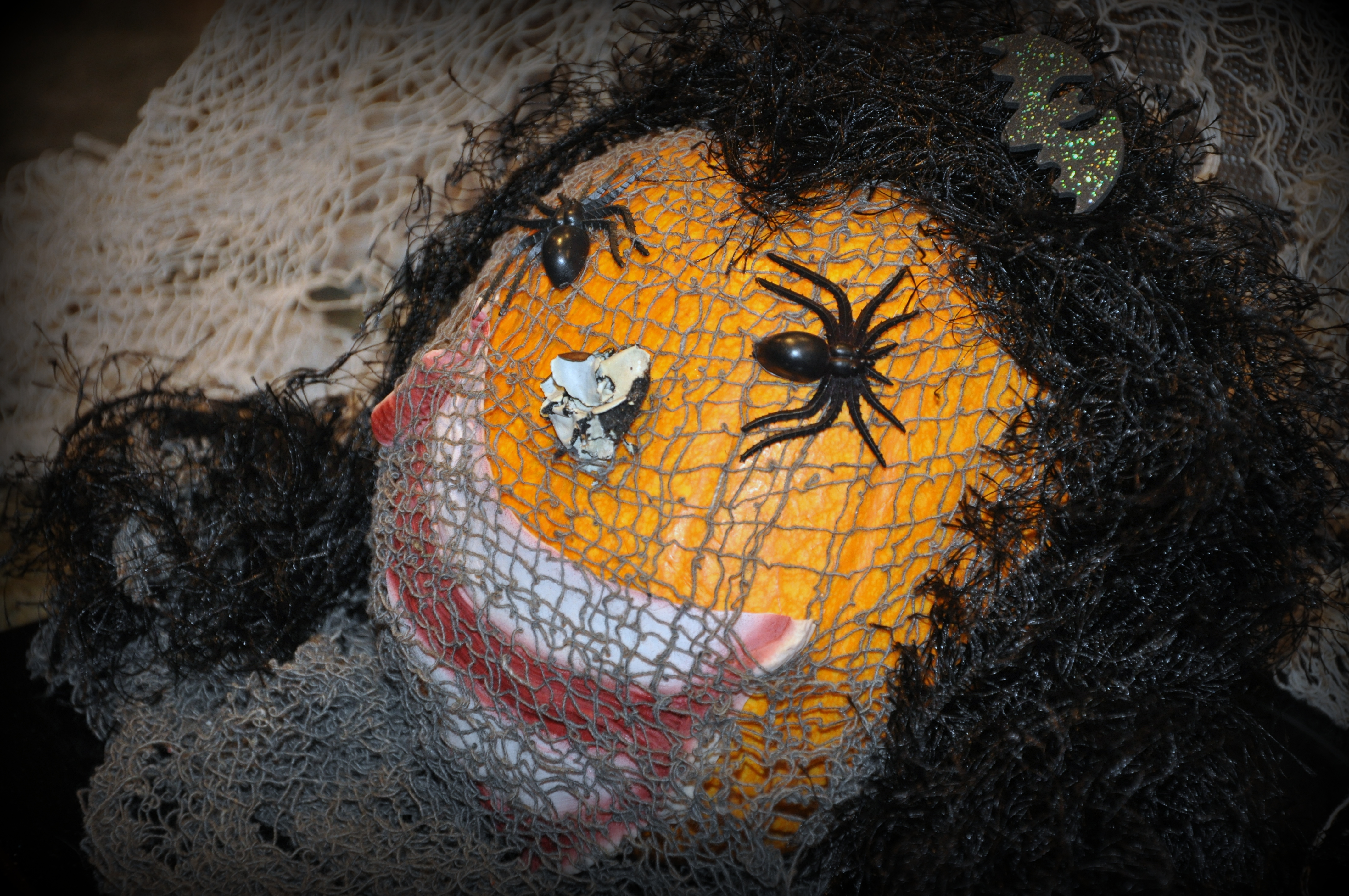 I stopped by my sister’s today and took pics of her wearing a witch’s hat, a gifted orange scarf, and a hand prop on her shoulder. We’re peas in a pod.