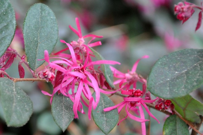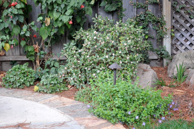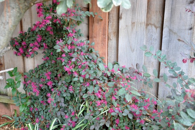 This beauty grows along the back fence under the Pittosporum. It gives a lovely splash of color from a distance, and continues to delight up close. Those fringe-like flowers look like fairy garden pom poms in the making.