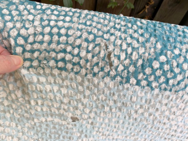 Then a squirrel came along and chewed the entire corner to get access to the soft cotton cording inside. How did she know? I thought at first it would be a simple repair, but she returned to gnaw the bottom half of the swing. That squirrel had a super-soft nest that year. In the end, the swing cover was a complete loss.