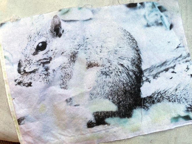 I enlarged a couple of my squirrel photos and printed them on inkjet fabric sheets designed to pass through a standard printer. I bought a yard of heavy muslin, cut it in half, and made a simple envelope-style pillow cover. I attached the squirrel photo using fusible tape, then ran a piece of trim on either side.