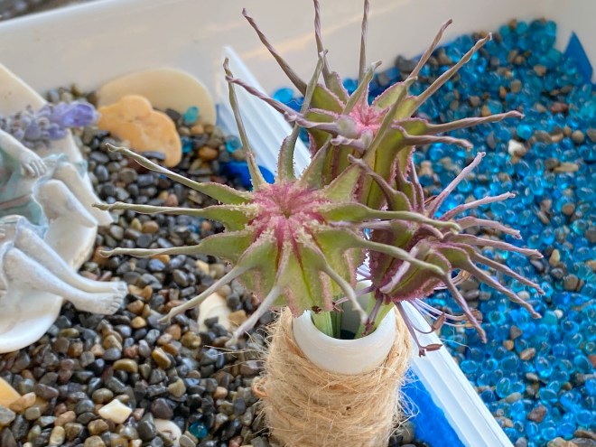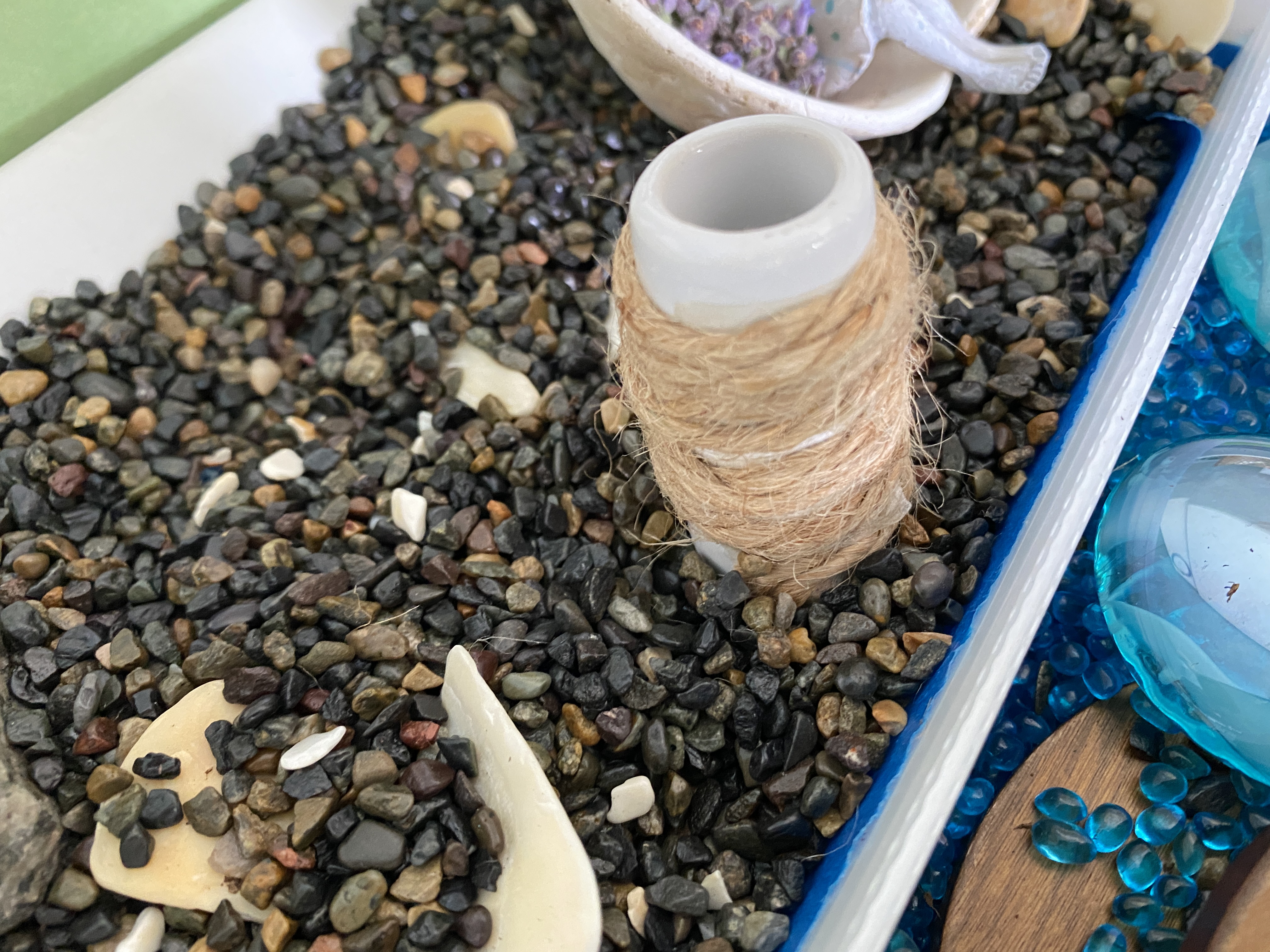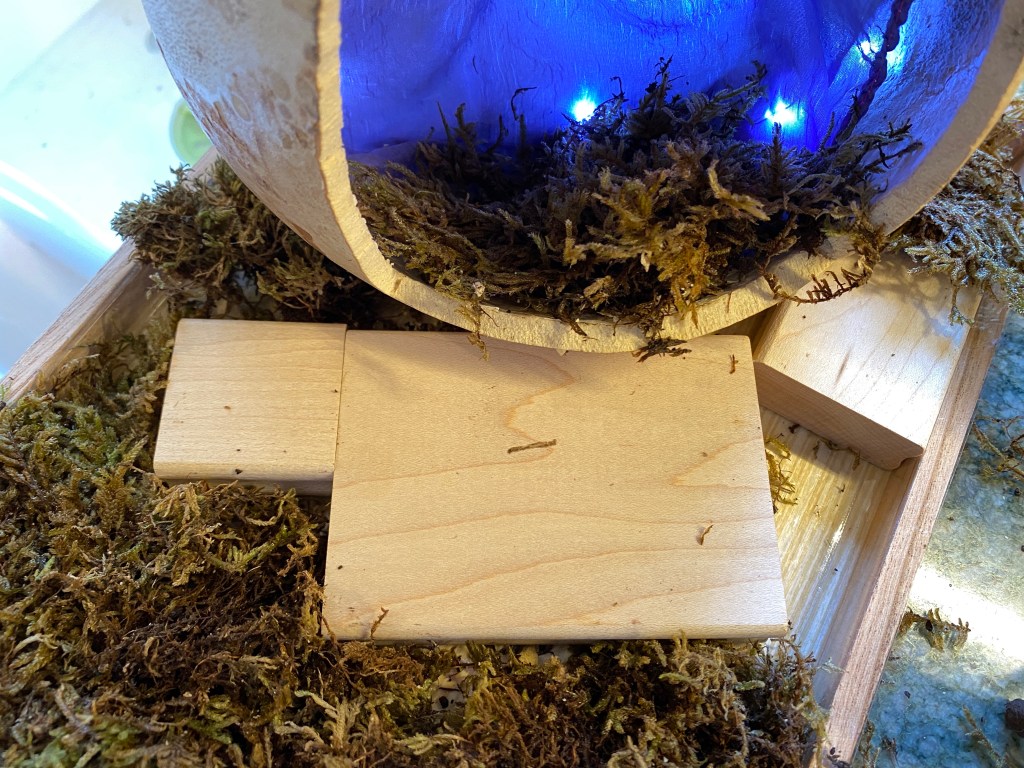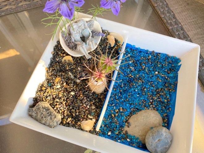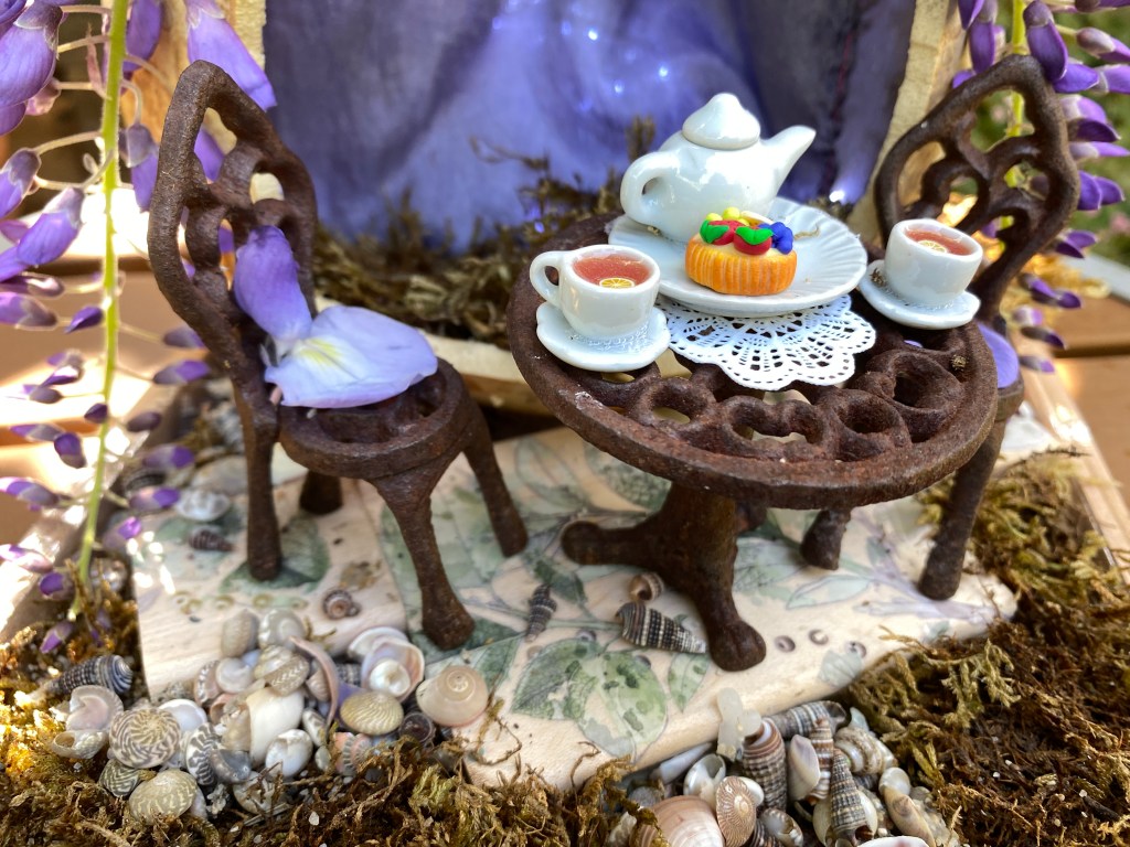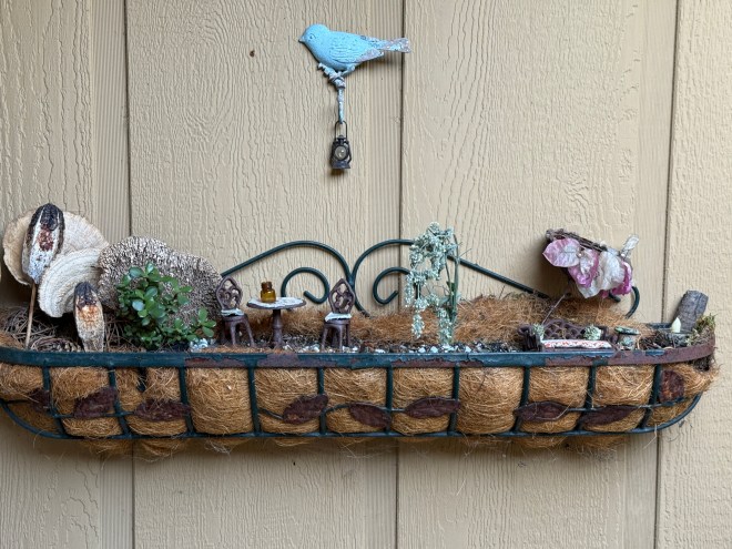 A friend sold these cardboard haunted house kits earlier this year. It was a lot of fun putting it together, and a bit of kismet when I realized I had the perfect tray for it. The three figurines were a birthday gift this year. Can you believe how well they fit in?