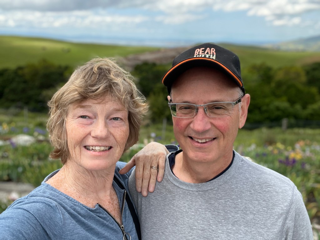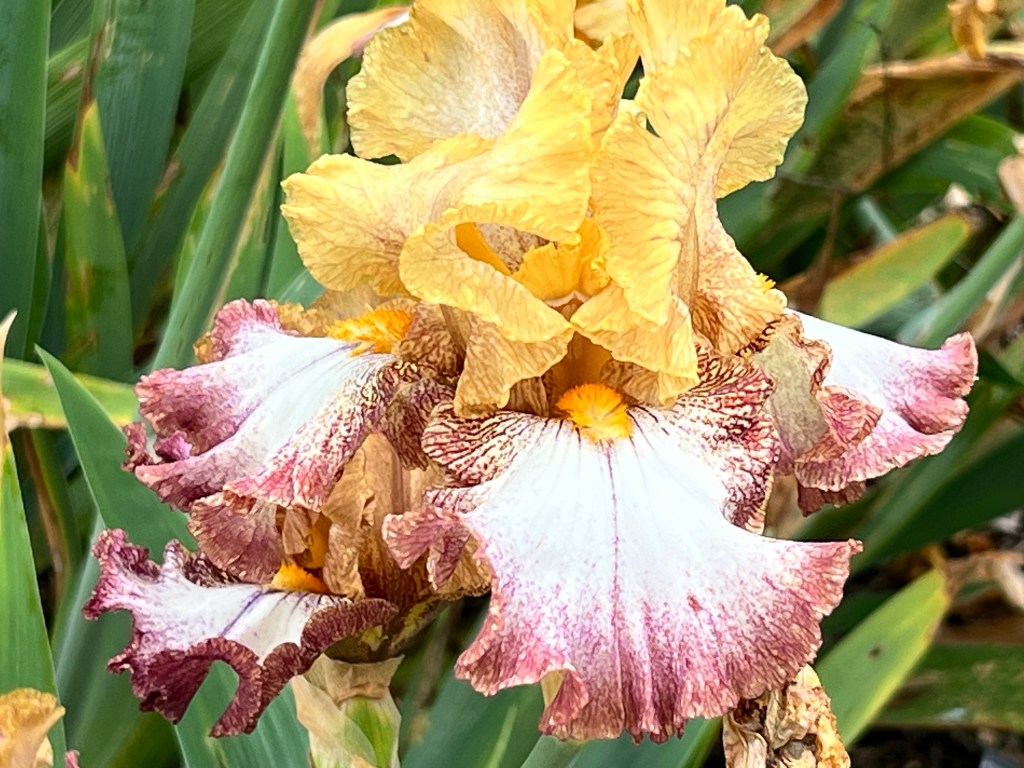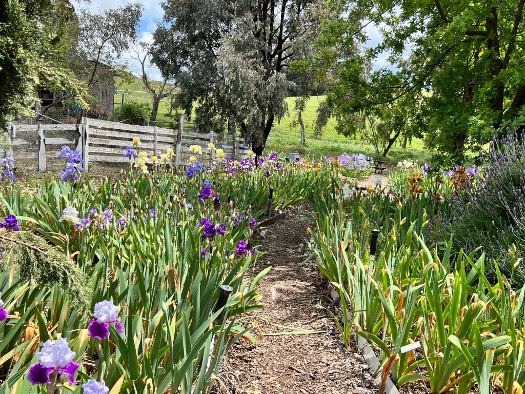 Today we toured Nola’s Iris Garden, part of Prevost Ranch just twenty minutes away. It was a feast for the eyes. My friend Elizabeth boards her horse in the stable adjacent to the gardens. She’s been encouraging me to go. The iris bloom was late this year due to heavy rains, but they’re up now and gorgeous. Nola has over 600 varieties planted along terraces at the top and bottom of a gently sloping hill. The views are also spectacular, and the recent rains have turned the hillside a lush green.