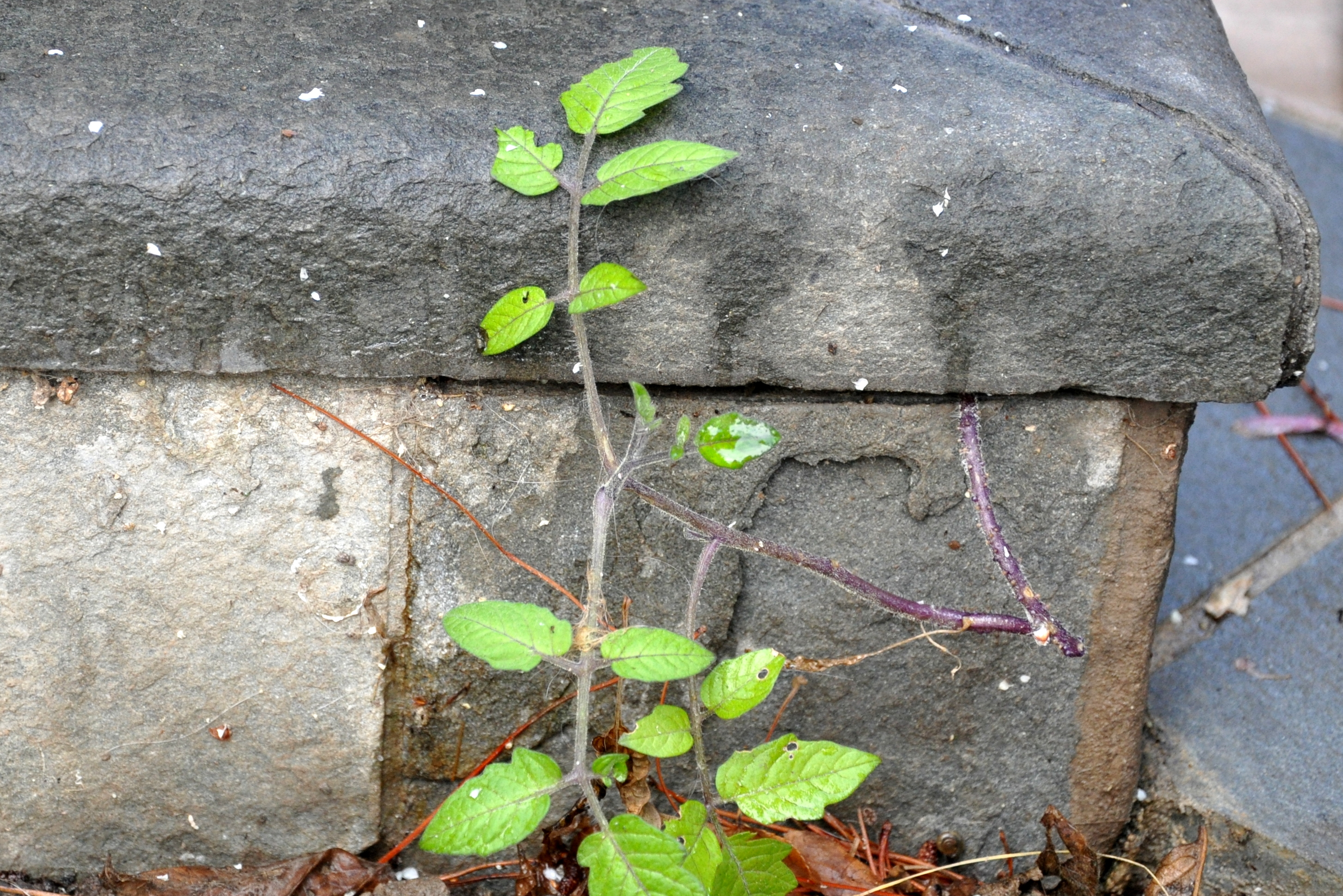 After clearing away the last of the Anemones, I found a tomato plant growing out of the bottom of the patio steps. It was probably staying warm from the plant cover and didn’t know it was fall. I can’t bare to pull it out, so I’ll leave it for now and see what the plant has in store. It makes me smile