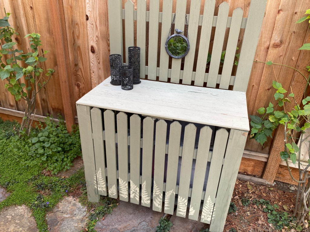 With the glider assembled and in place and the new umbrella cover overhead, I changed my mind about the small blue tables. I’m using a round table instead. I’m going to paint the top of the blue tables with chalk paint, but I’ll leave the legs the faded blue. I’ve moved the tables close to the hose bib, where I’ll use them for my assorted watering cans.