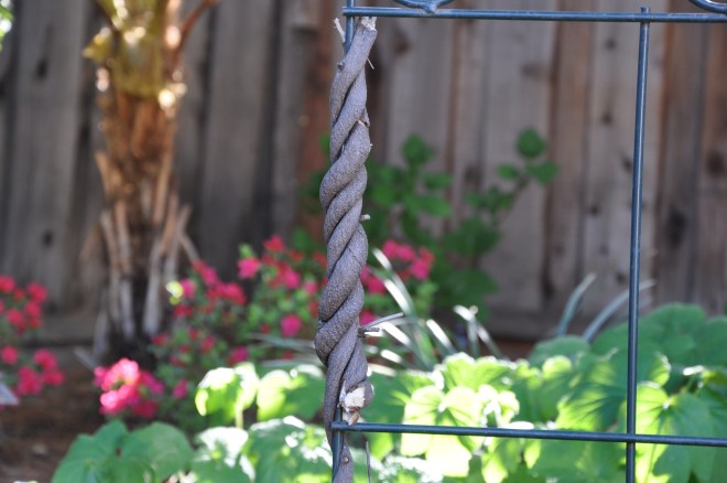 After wandering around the garden, I donned my gloves and my shears and tackled one of my projects: the now deceased Hardenbergia vine.
