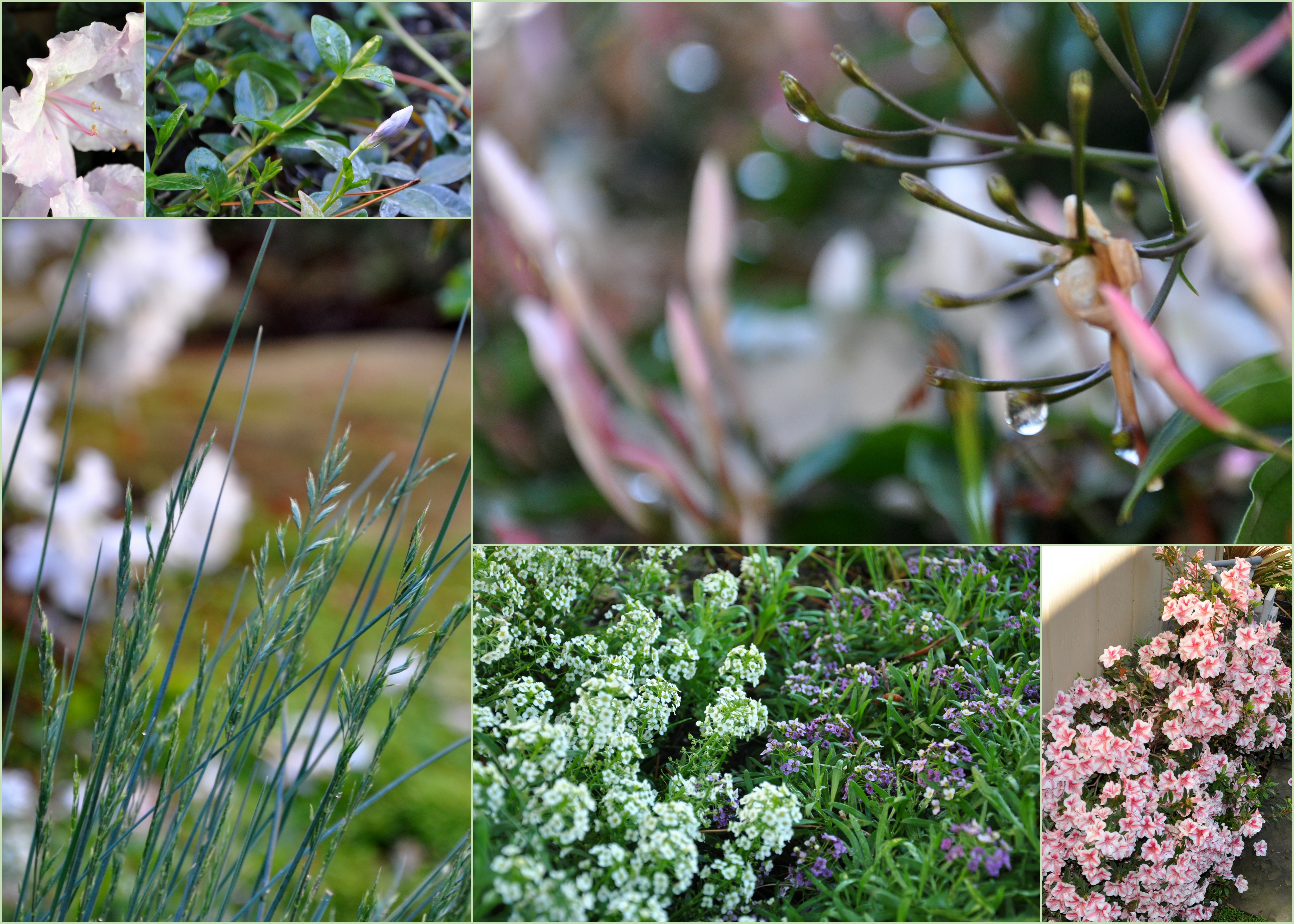 Side yard garden darlings: petal pink azalea, budding Jasmin, blue fescue, white and purple alyssum, pink azaleas camouflage the meter