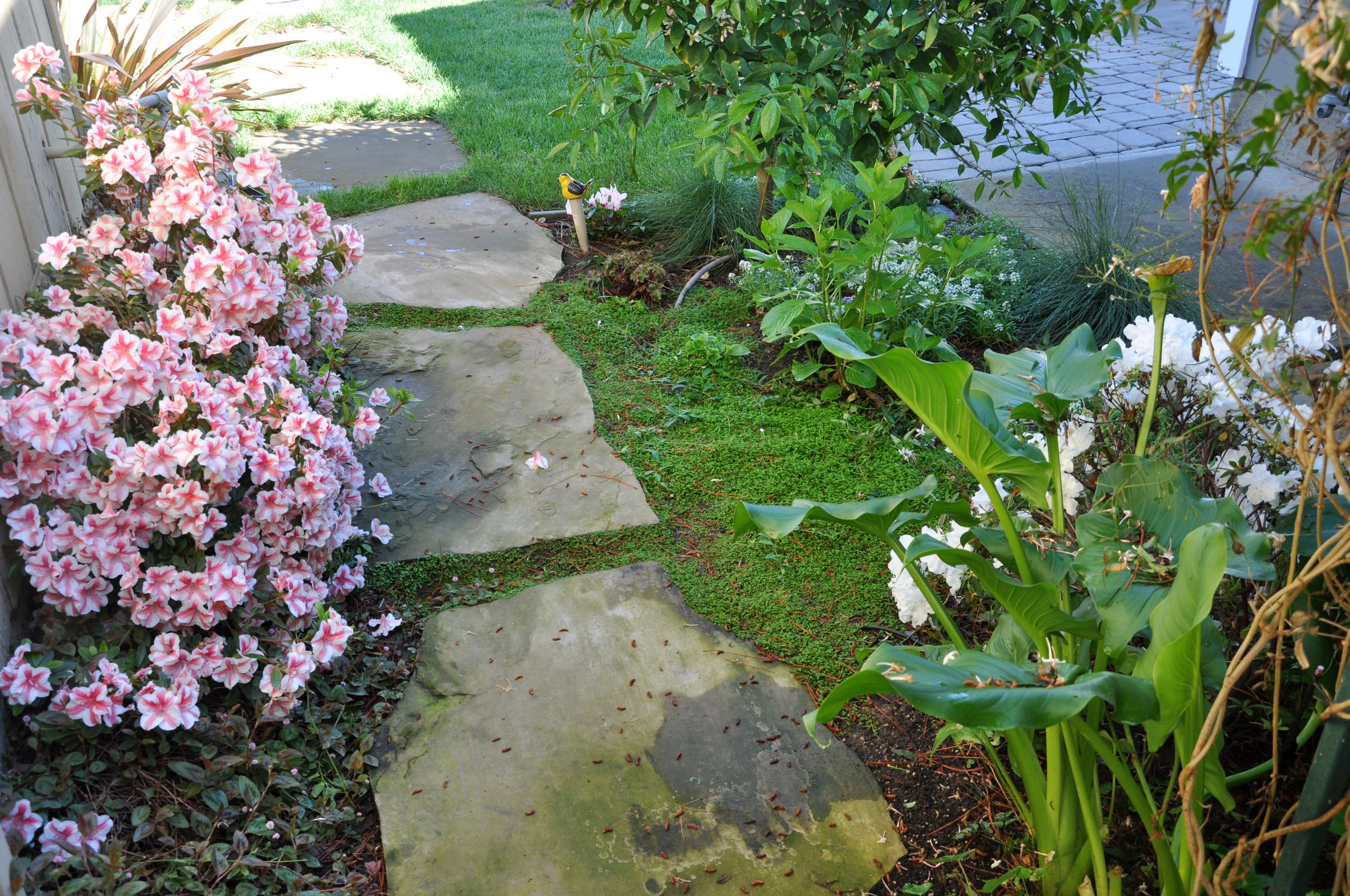 So when the neighbor asked if the shrub could go, the answer was a resounding yes! Between households, there were five children, all under the age of ten so I suggested a ‘children’s garden.’ It would be a place for them to play, plant and experiment. A small wooden bridge, once in the backyard, spanned the tiny space and unified the area. I relocated my dinosaur topiary and Mike transplanted a pair of azaleas from the back yard. The kids loved it. At one point my six-year-old decided to dig a ‘hot tub’ in the middle of the garden. Shavings of sidewalk chalk turned into magic dust, as long as you believed. I miss those days of wild imaginings.