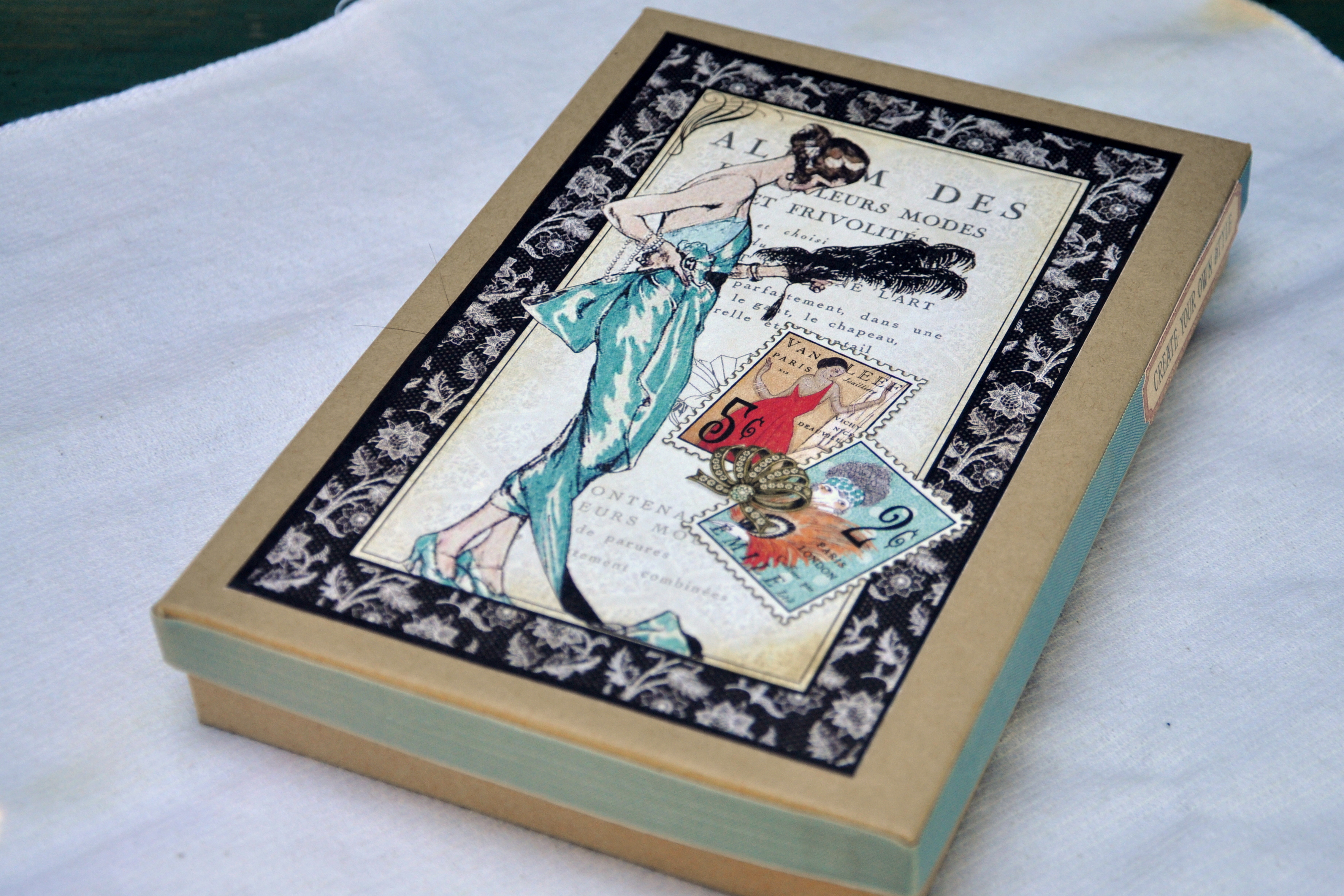 I trimmed the box and some of the cards with vintage seam binding from my friend Donna’s Antique Row booth. She sells a variety of ephemera with a changing selection, so it’s always fun to go look (and buy).