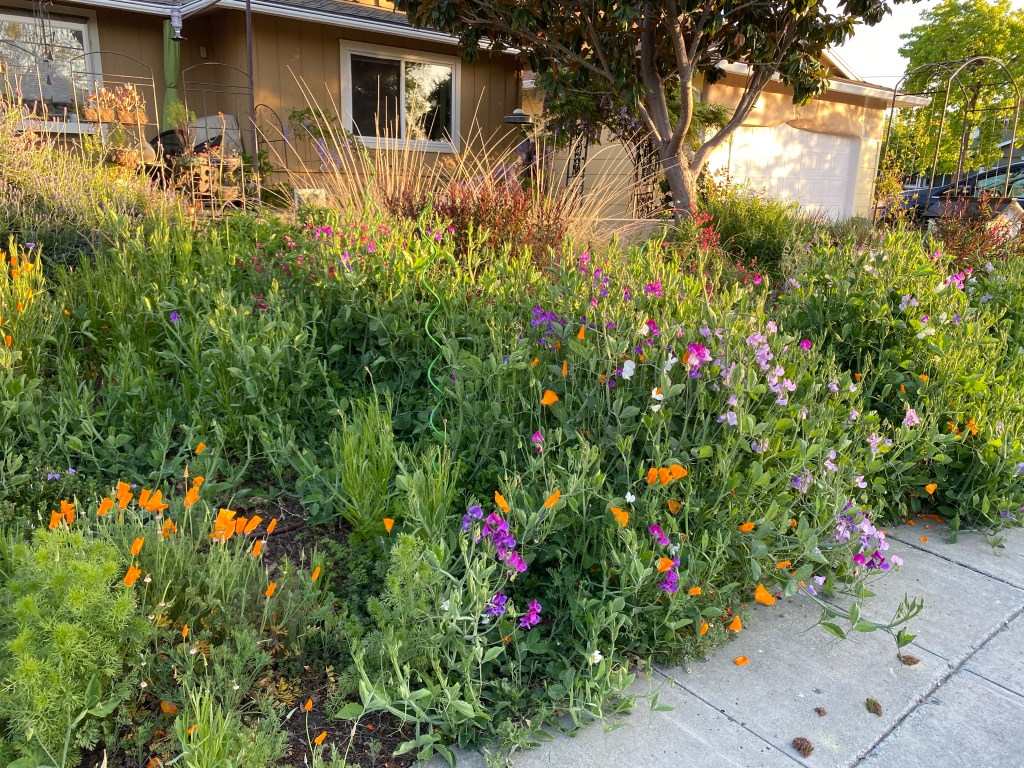 The Jungle, a self-seeded garden of Love in a Mist, Sweet Peas, California Poppies and Cornflowers in their prime.