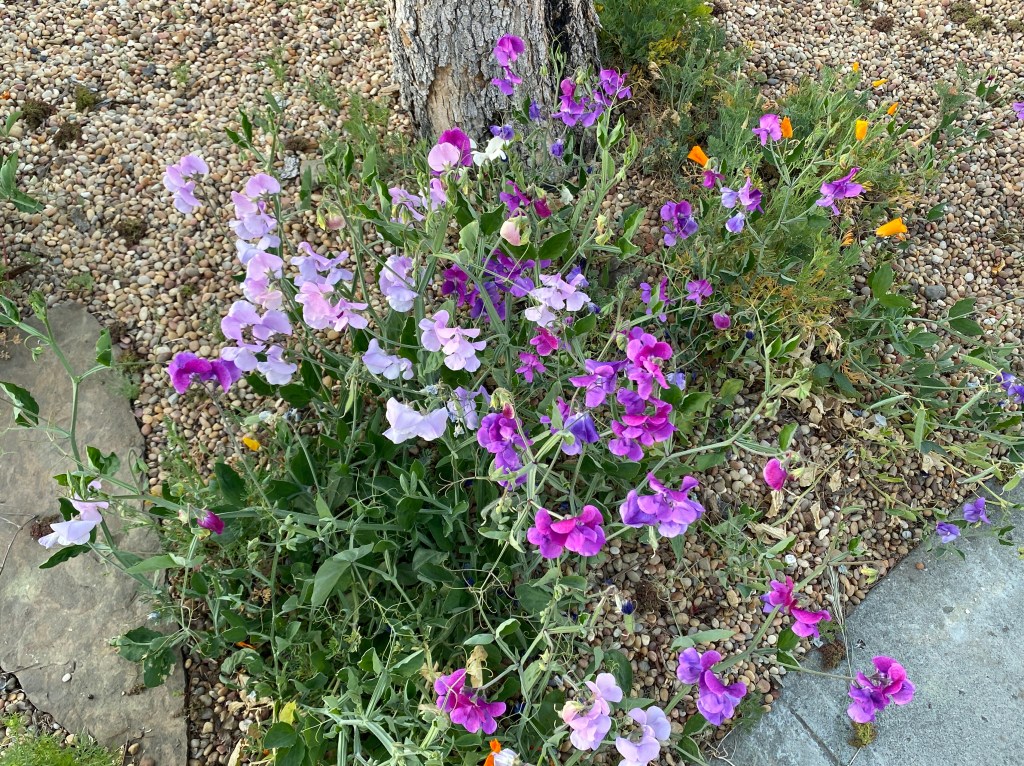 I’ve thoroughly enjoyed the jungle in all its wonder. Sweet peas self-seeded early this year, followed by love-in-a-mist and then cornflowers. All of the flowers are various shades of purple. I love the way they offered each other support.