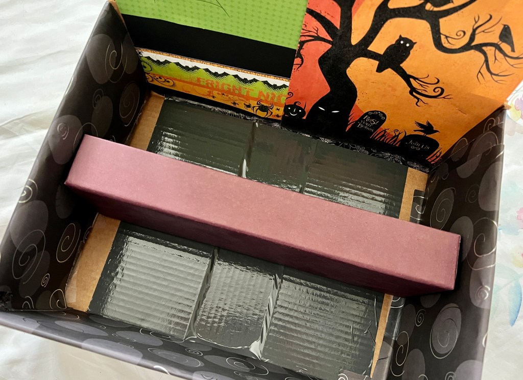 The box is too deep to display the kits, so I used a cardboard lid to divide it, covering it with gauzy Creepy Cloth.