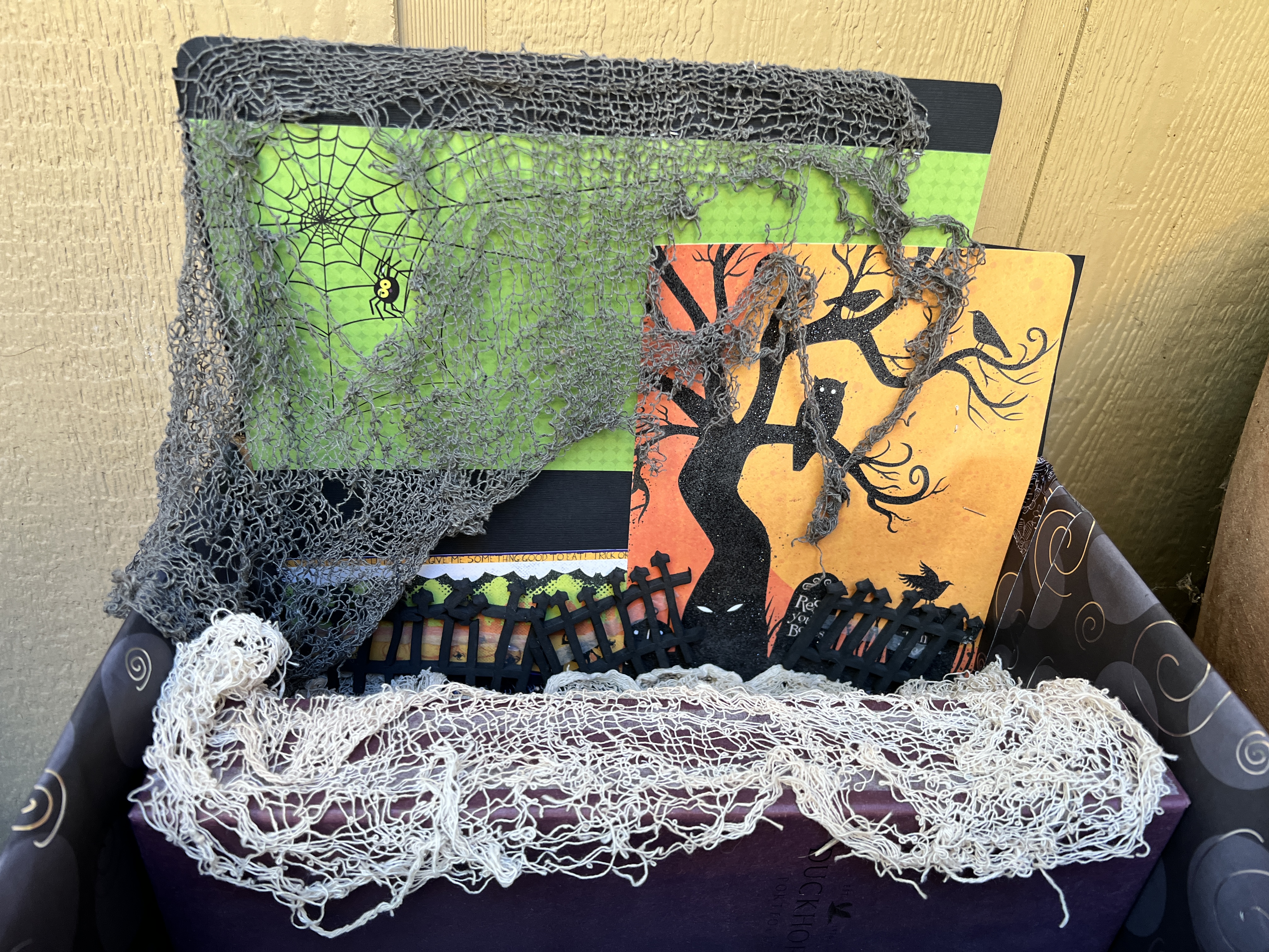 This final card is made from a sheet of acrylic embossed with spider webs. It’s been part of my stash for years. I liked it when I bought it, but I could never quite figure out how to use it. I think I used it on a card many moons ago, but I couldn’t say for sure. I like the effect.