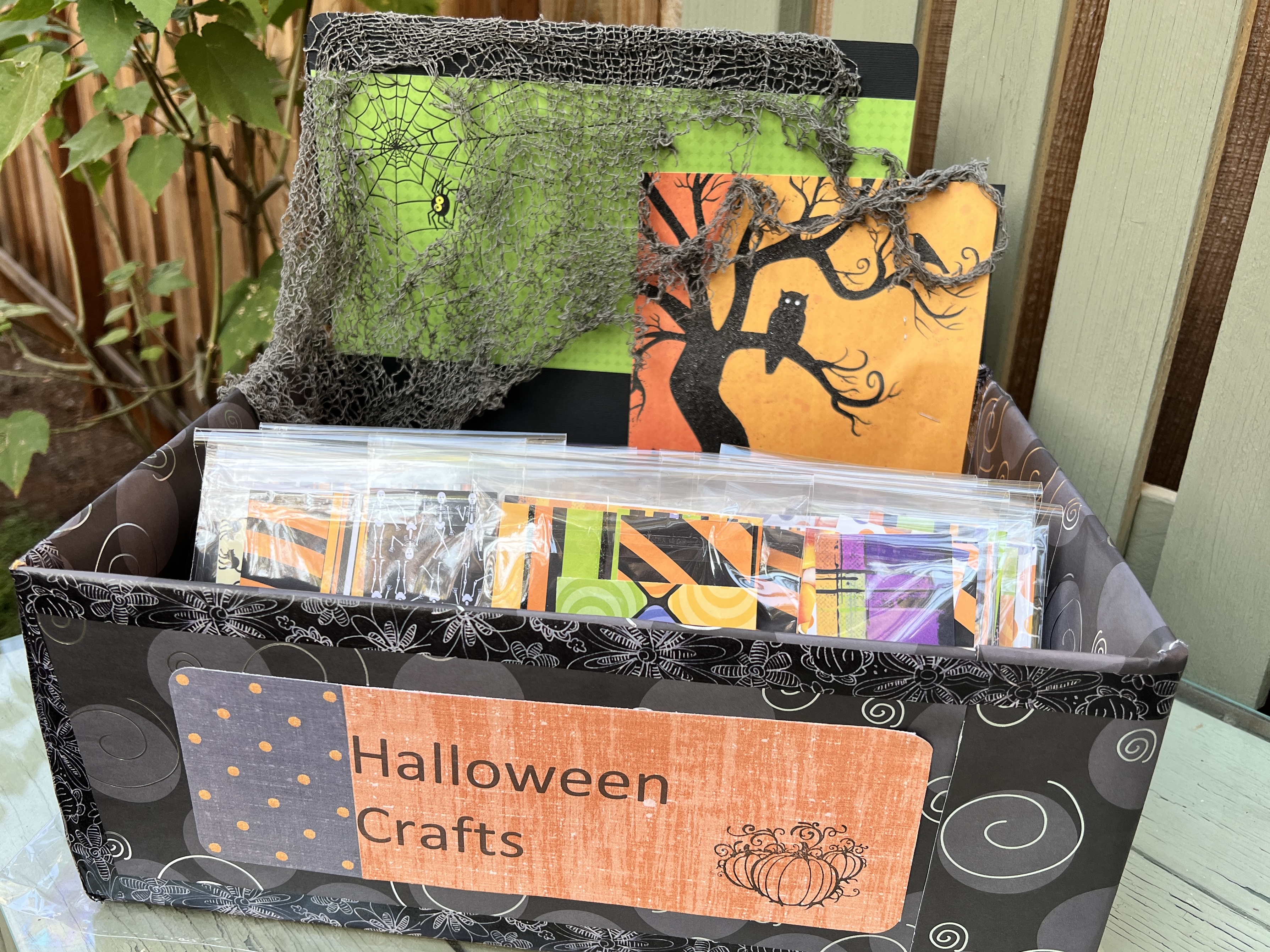 Last night, just before dozing off, I thought it would be fun to decorate a themed box for the craft kits. So I pulled out the box I used last summer for kits and covered it with scraps of Halloween paper, leftover Washi tape, and the remnants of my son’s haunted house phase. He’s a senior at university, so those scraps have also been around.