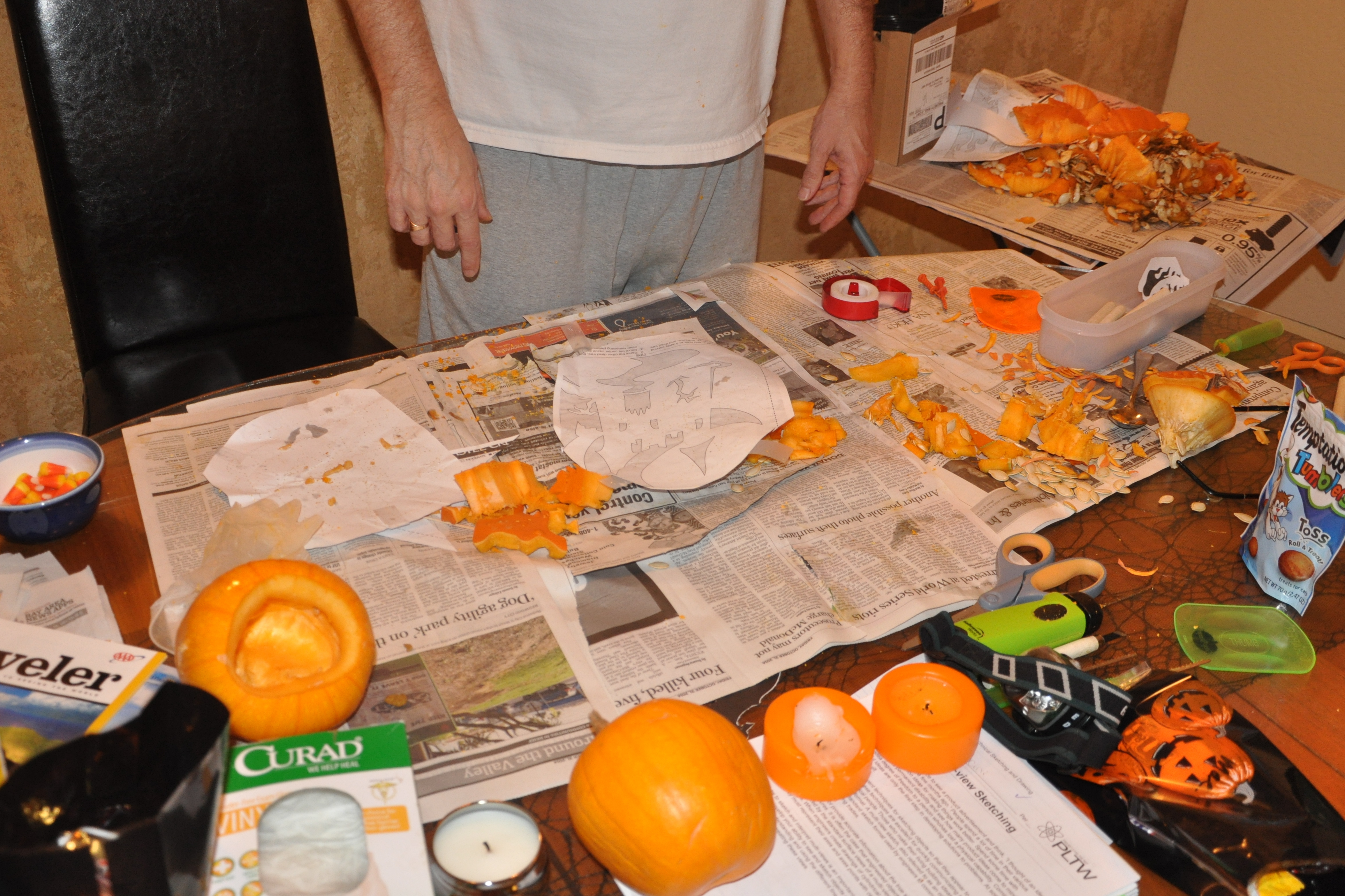 Inside, Mike guts three pumpkins and decides what to carve. He traveled the day before, up at 4:00 am and home at 10 so he’s tired. Lindy offers moral support. Mike chooses three of his pattern favorites.