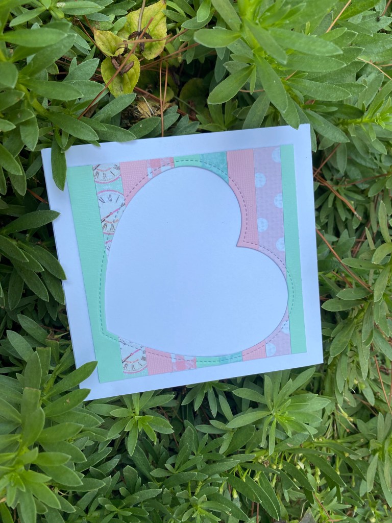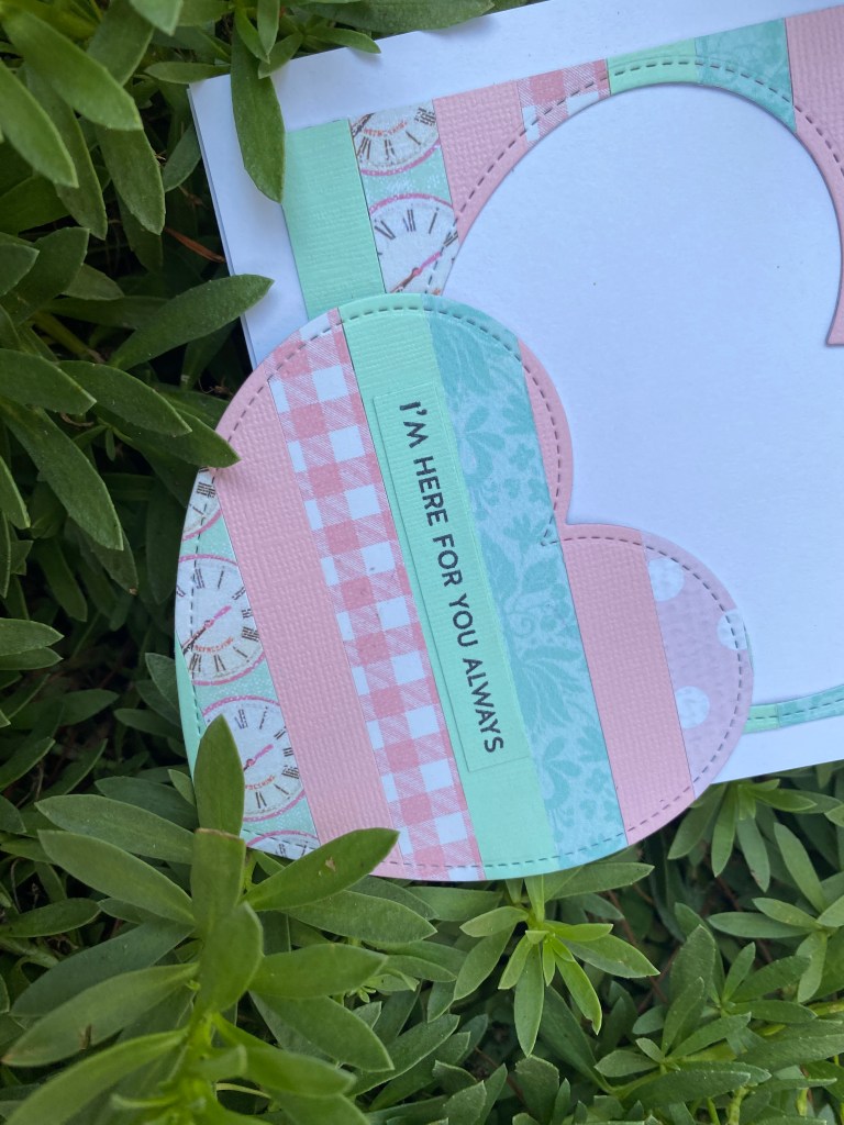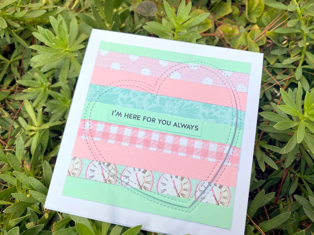 This last card is for a special friend who suffered an unimaginable loss. I made this card by laying down half-inch strips in a simple square pattern before cutting a heart from the center. Next I raised the heart with small pieces of foam tape, then replaced it in the heart-shaped opening. The raised heart adds some interest and texture, though it’s hard to see in this photo.