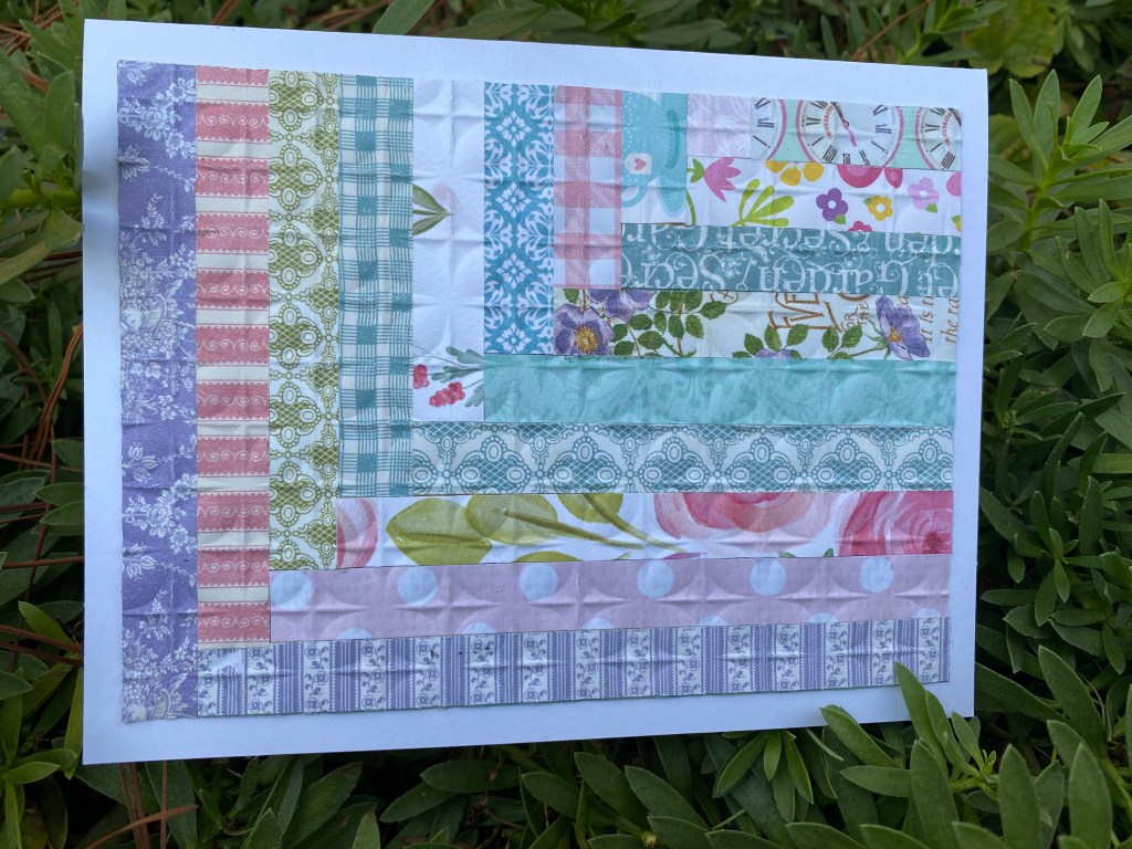 This might have been the last card of the day before the Tessa interlude. I used 18 different paper scraps. It reminds me of some of the heritage quilts I’ve seen over the years assembled from old clothing pieces. I’ve always admired the history and beauty of those quilts.