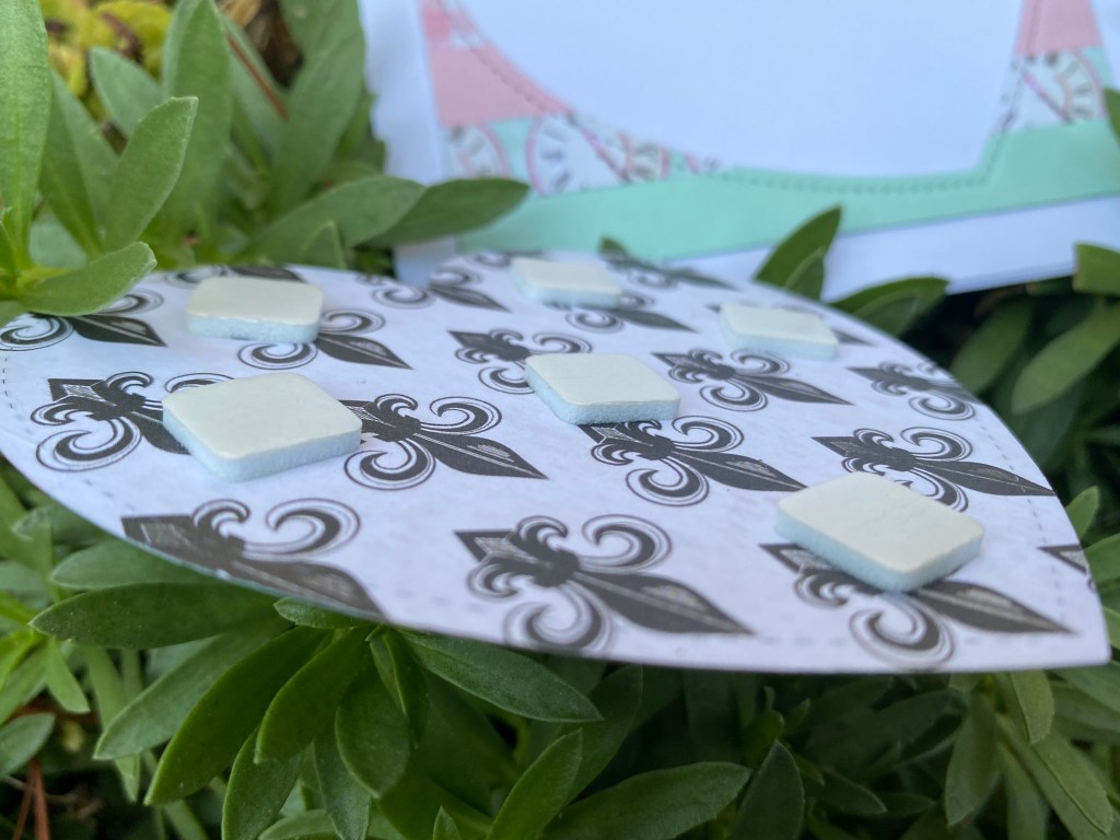 I enjoyed using one solid and one pattern on this card. The sentiment is printed on the reverse side of the fan-shaped paper.